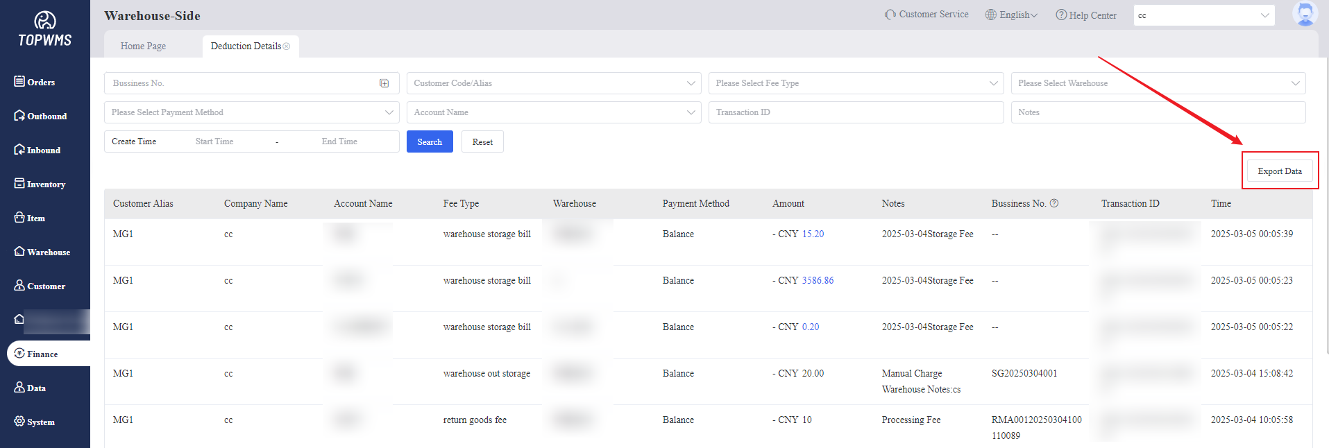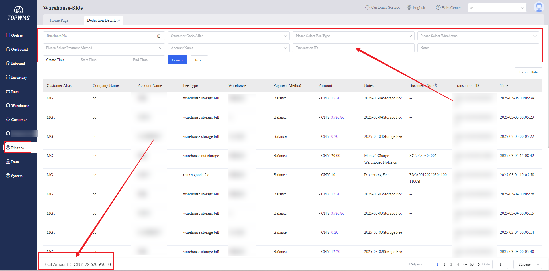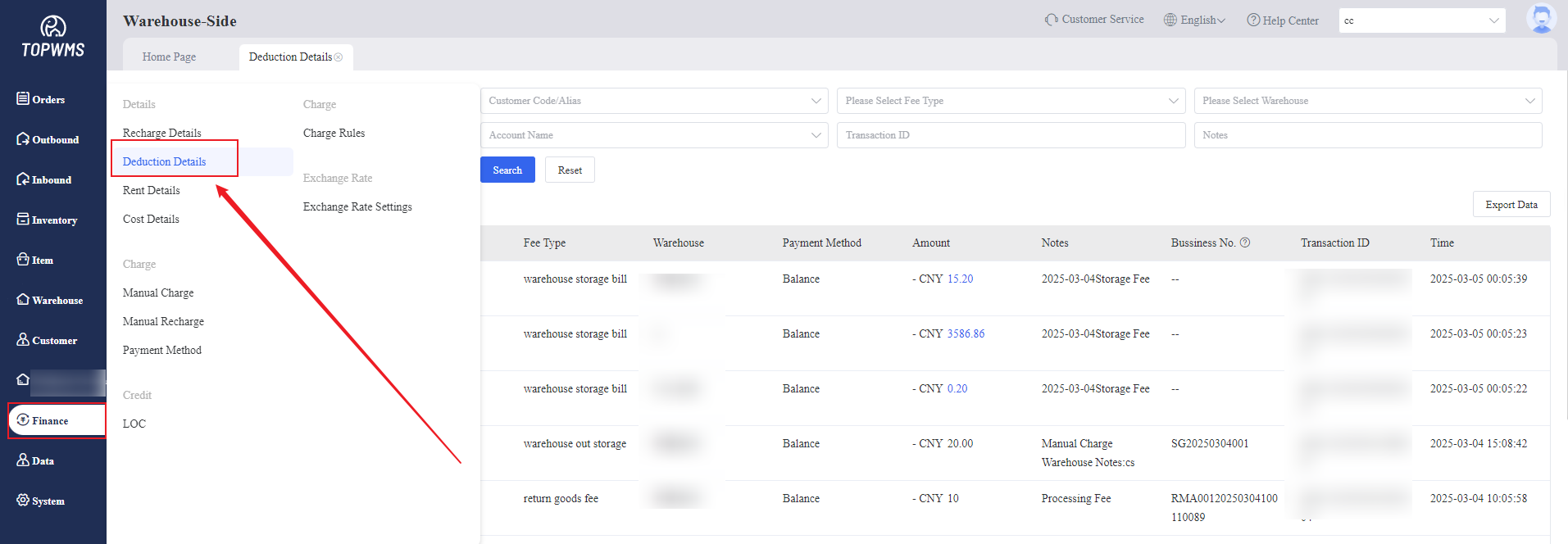 (1) Click [Finance] > [Deduction Details], the billing records of all customers and businesses, including all deduction scenarios can be viewed in this page.
