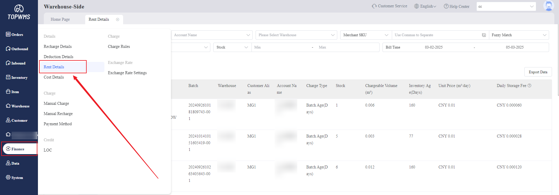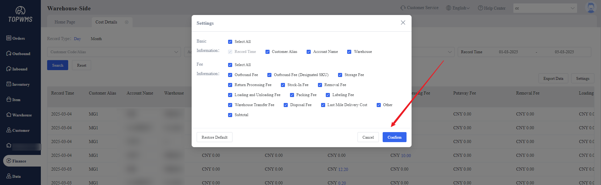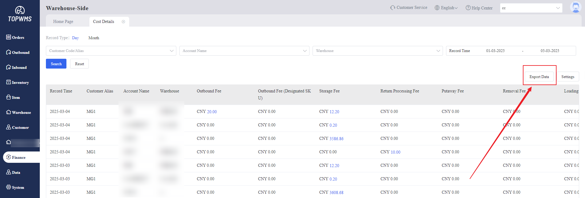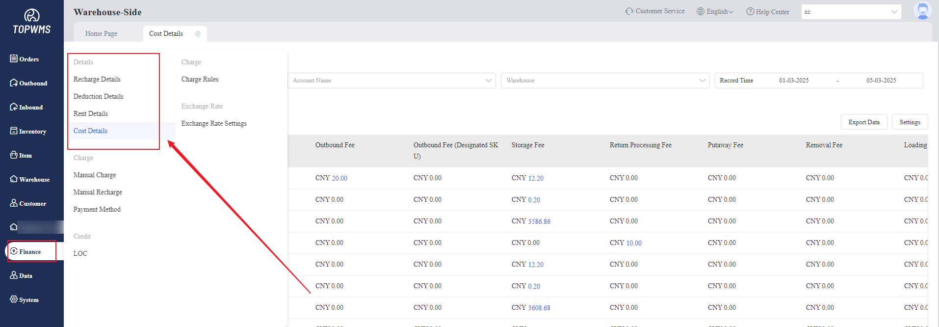 (1) Click [Finance] > [Cost Details], warehouses and merchants can check bill information over a period of time through viewing cost details to ensure that the deduction amount is accurate.
