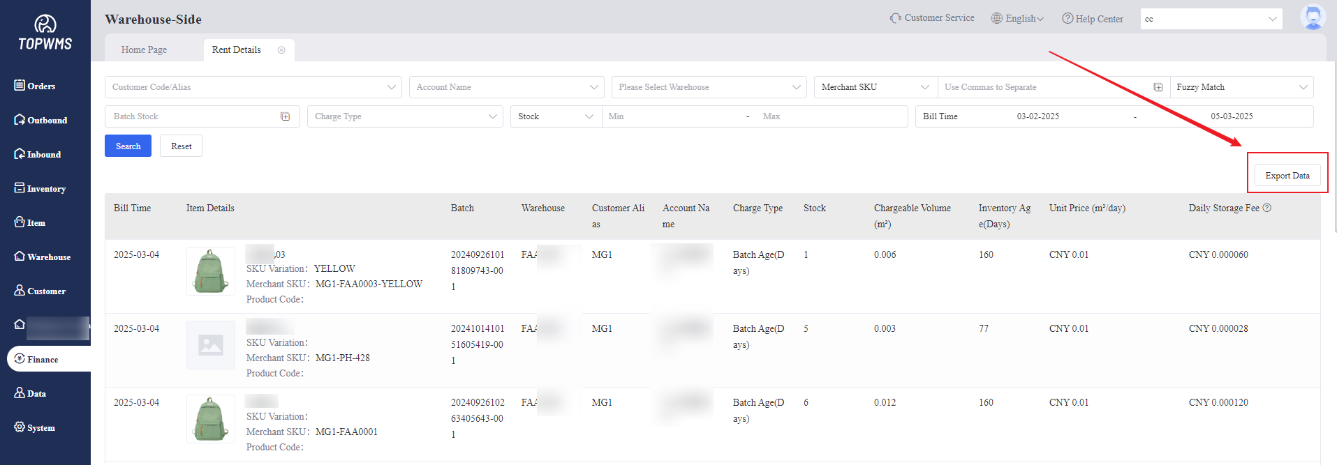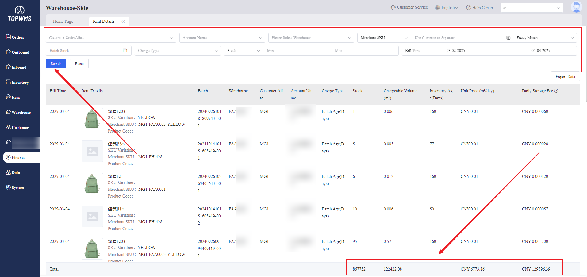 (3) Rent Details: Used to view the warehouse rental deductions of customers, filtering by date, customer, product, etc. are supported. Chargeable volume, stock, storage age, storage fees and other information can be viewed.