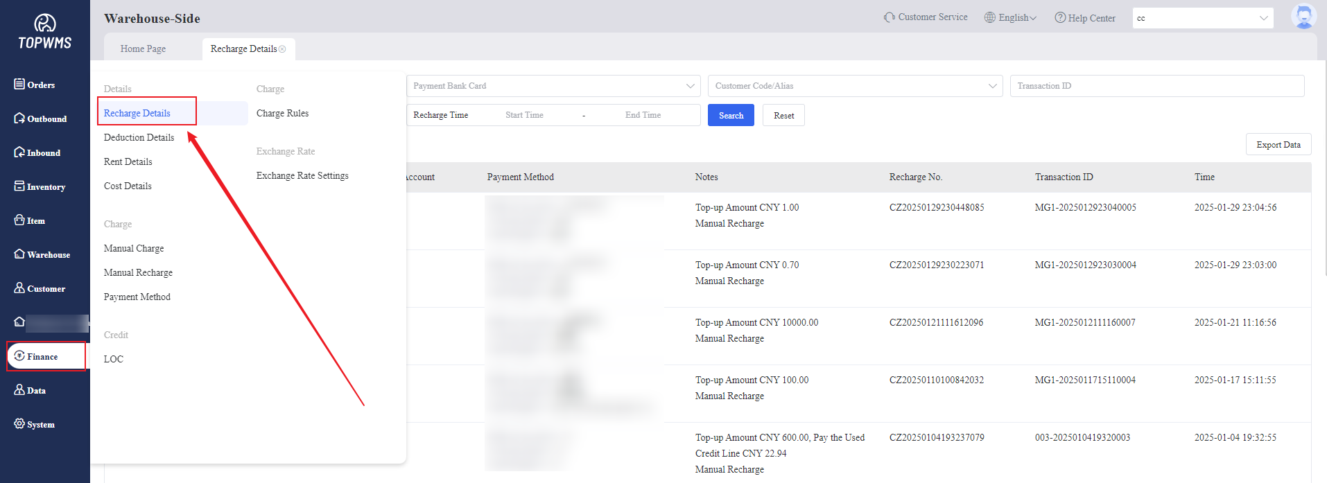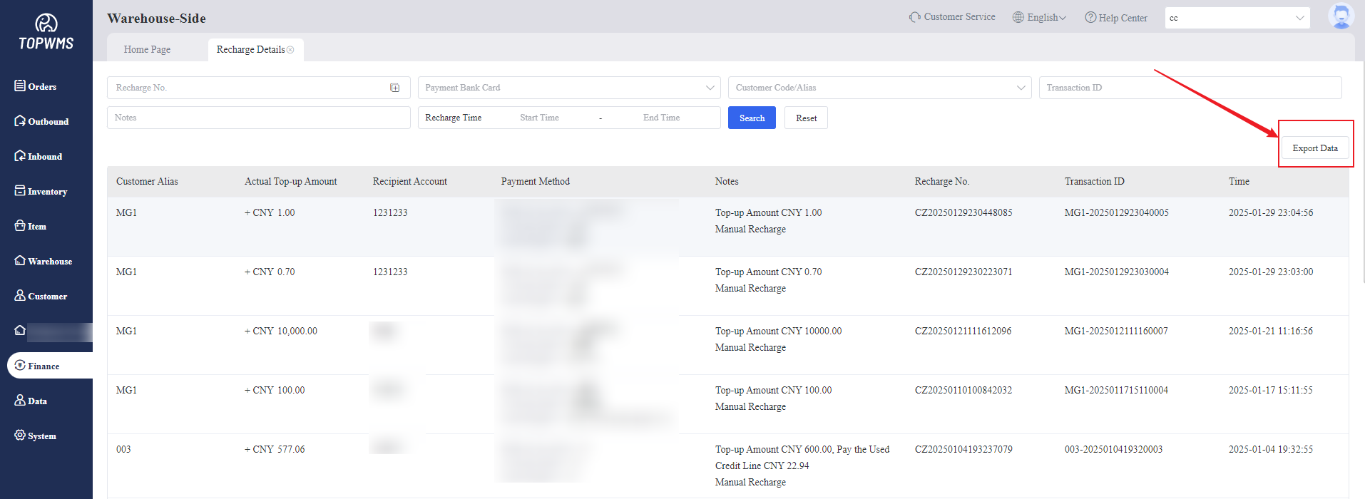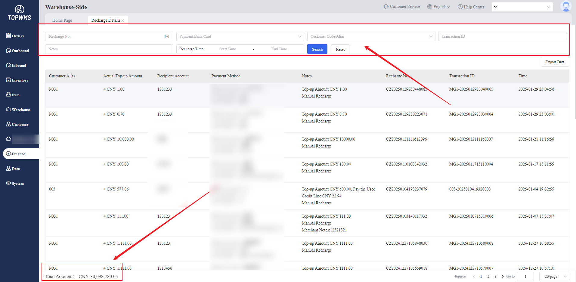 (1) Recharge Details: Used to view the warehouse recharge amount, filtering by date, bank card, customer, etc. are supported.