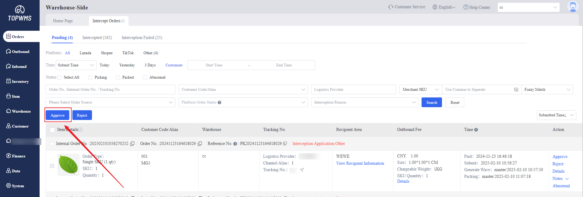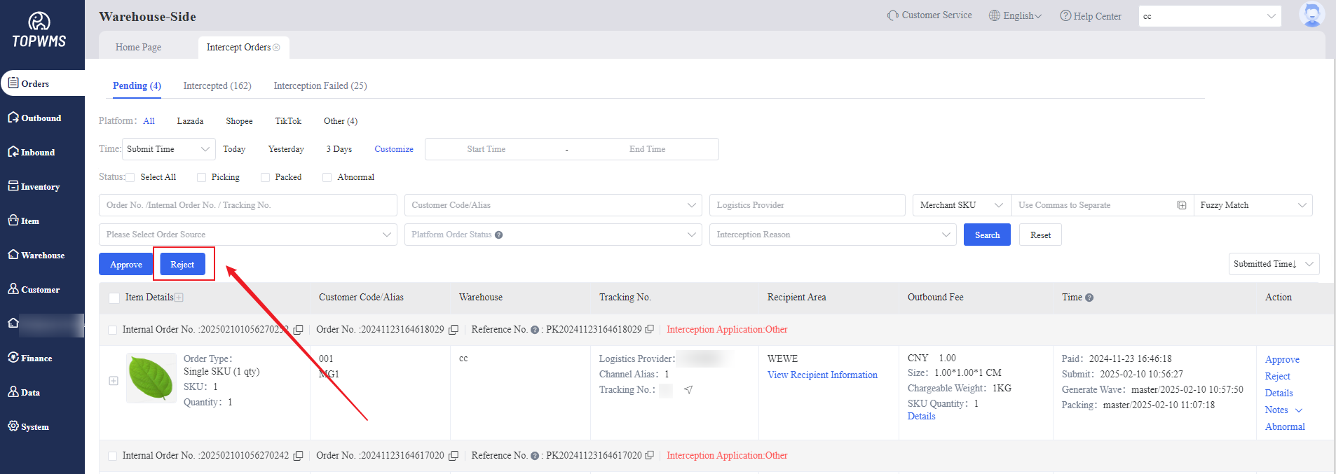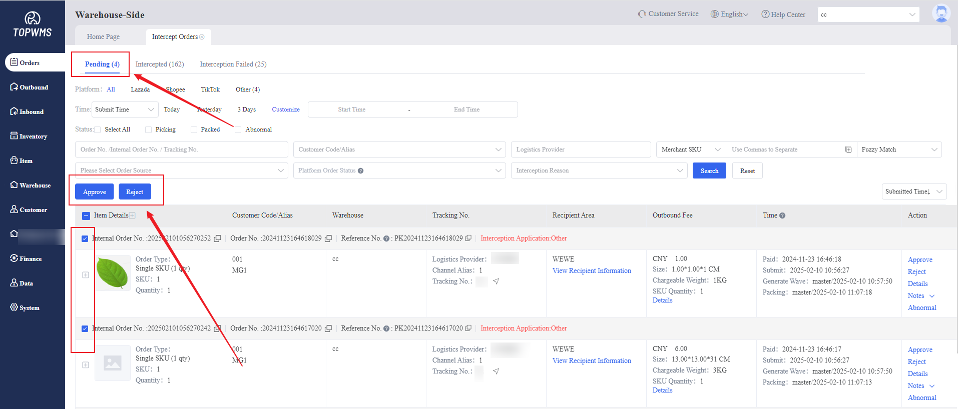 The orders need to be intercepted can be saw in 'Pending' status. Check the orders > click [Approve] or [Reject]
