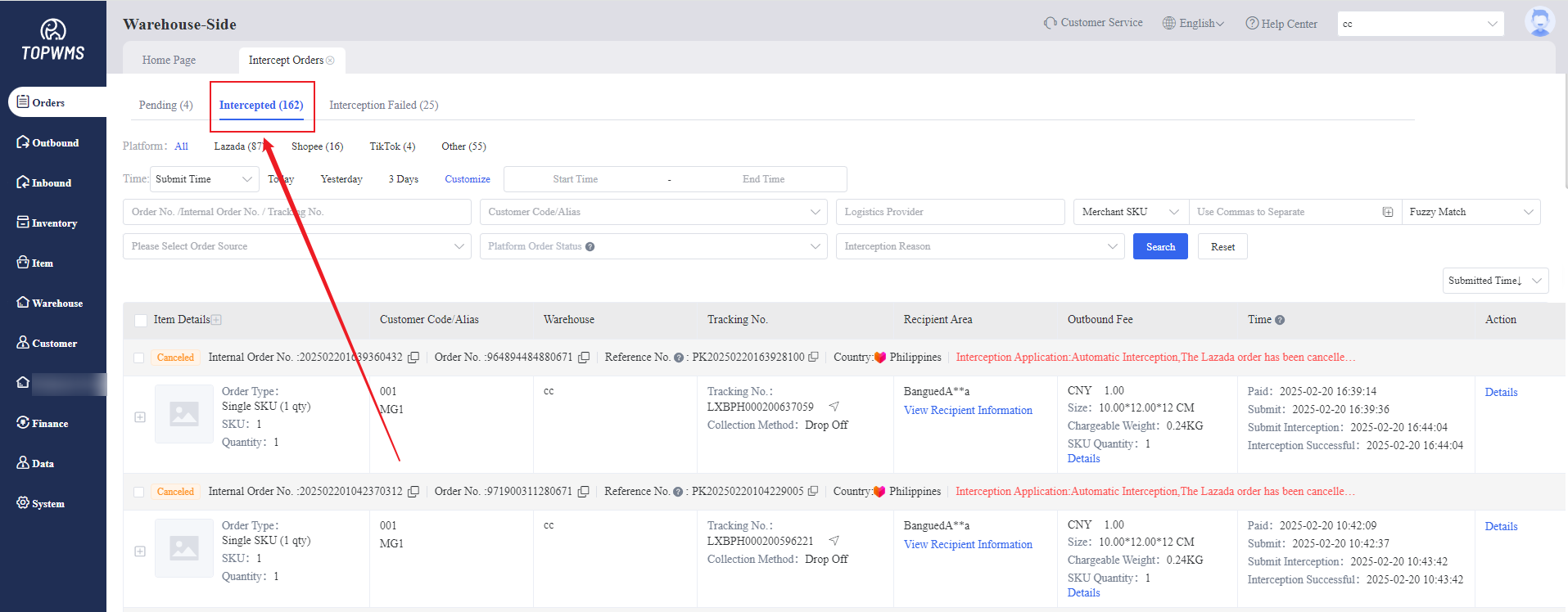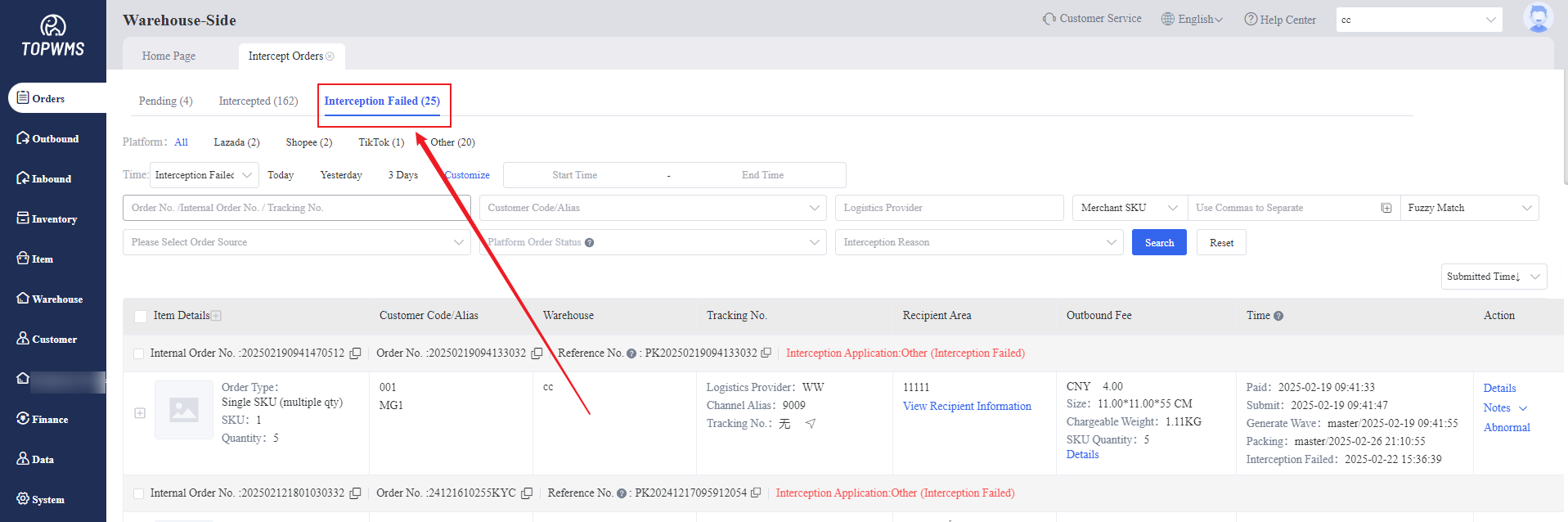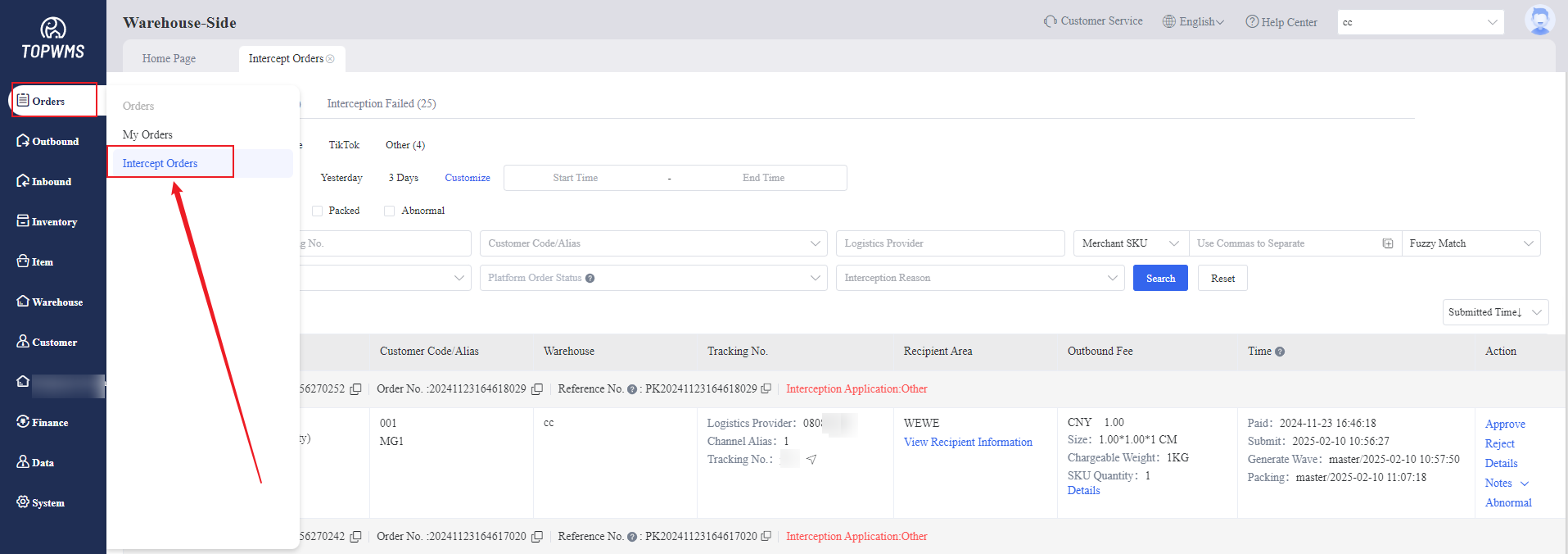 Click [Reject], failed to intercept the orders and orders are moved to the "Intercept Failed" state.
