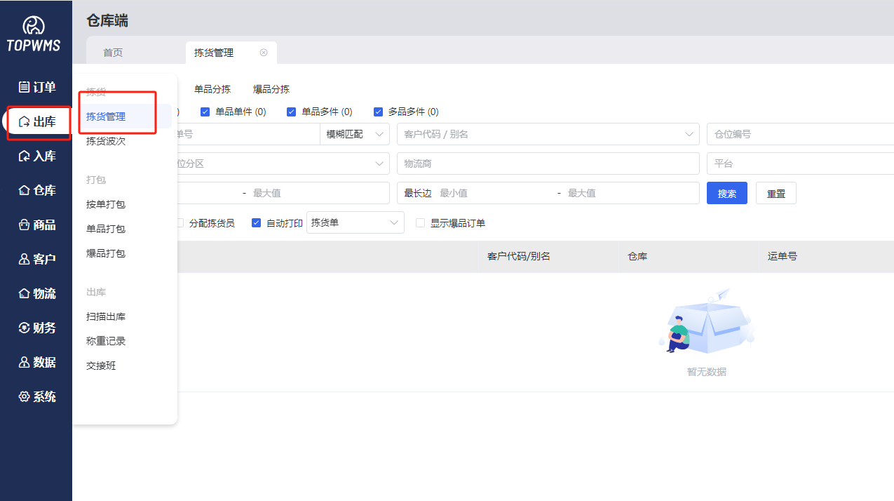 3、点击出库=>拣货管理,现分货模式分为按单分拣、单品分拣、爆品分拣;可以按照订单类型选择分拣模式