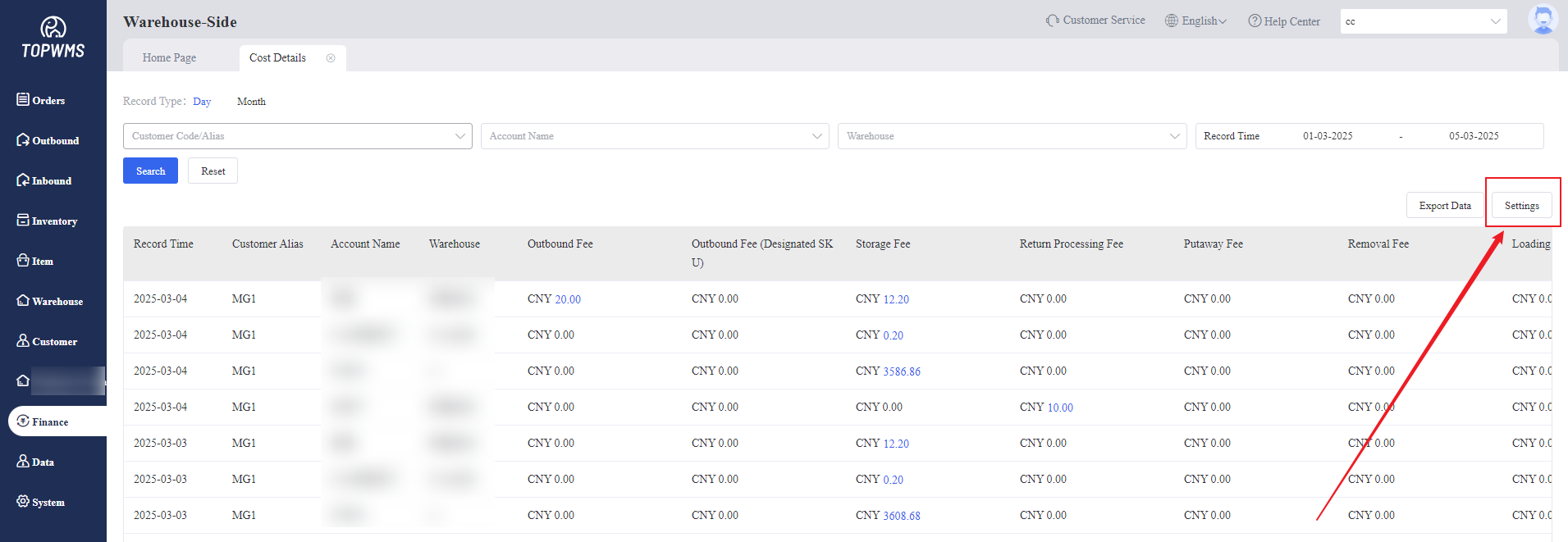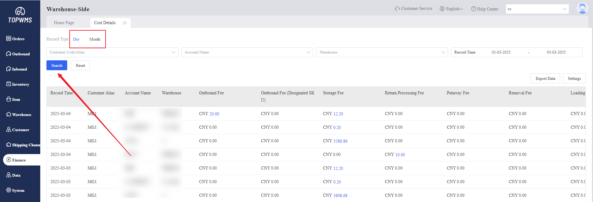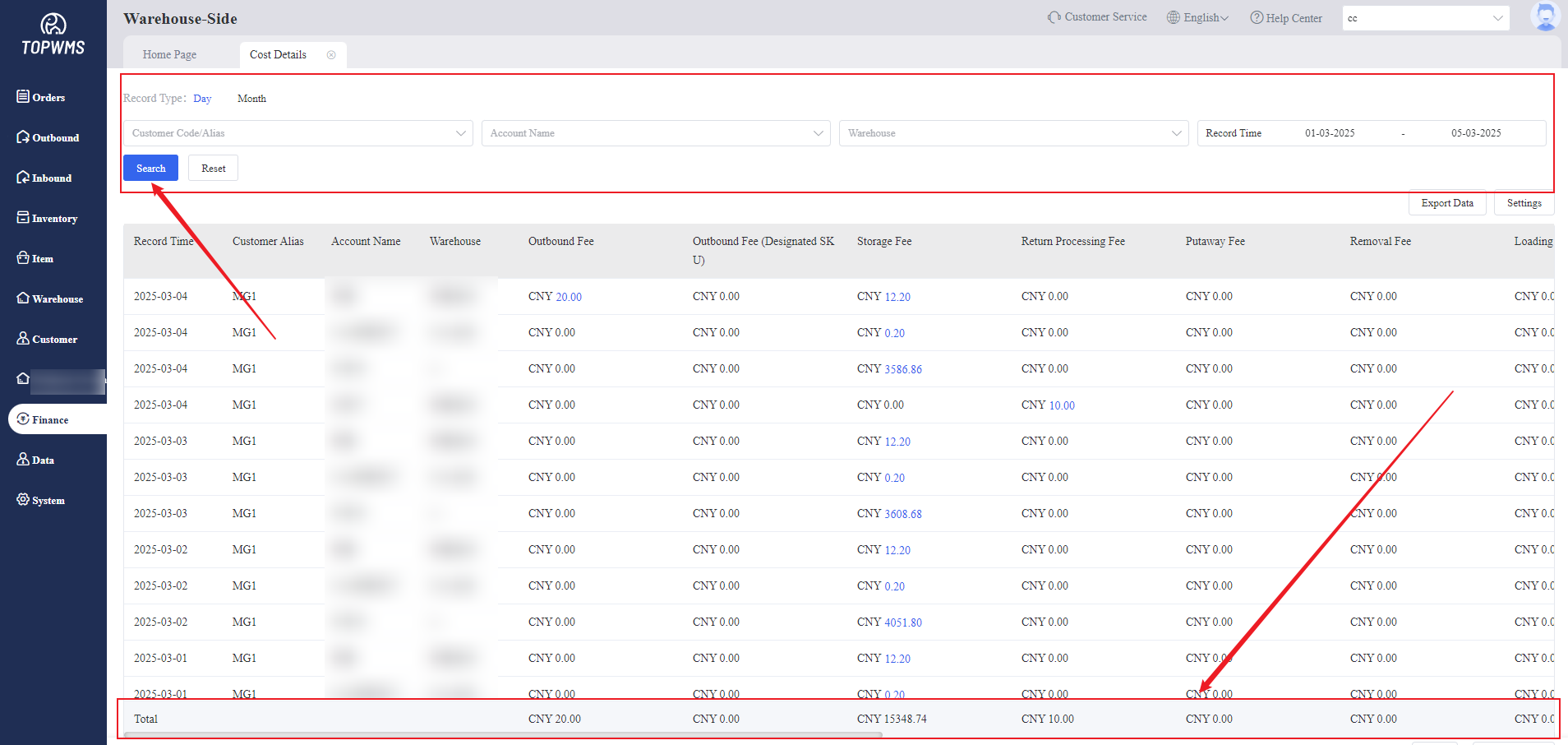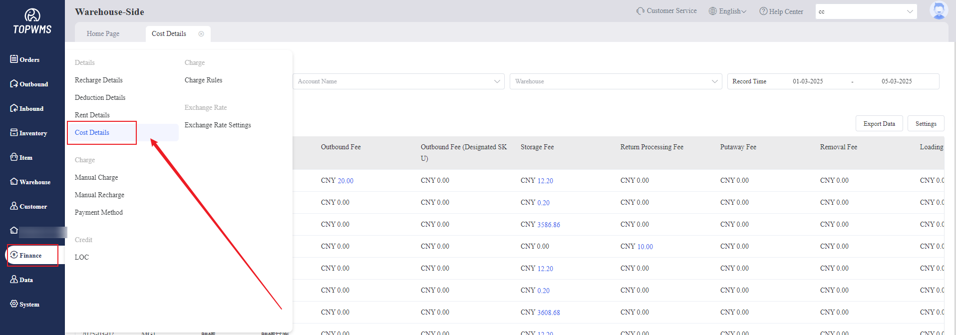 1. Click [Finance] > [Cost Details], warehouses and merchants can check bill information over a period of time through viewing cost details to ensure that the deduction amount is accurate.