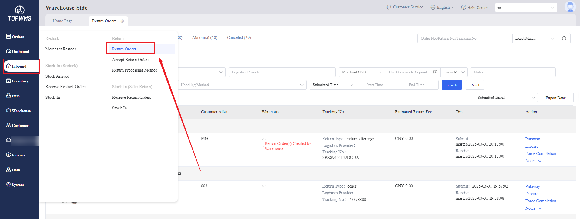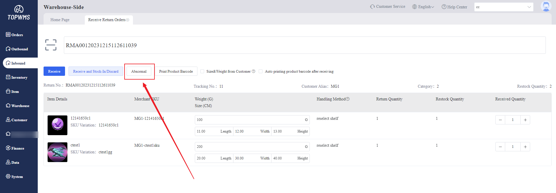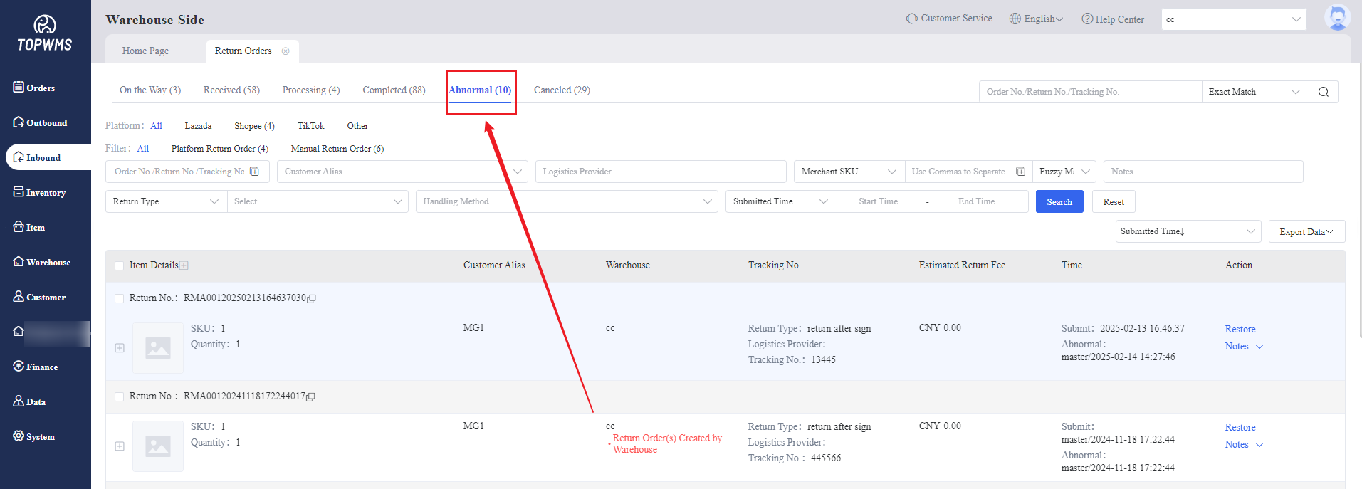 (4) Click [Inbound] > [Return Orders] > [Abnormal], the abnormal return orders will be displayed on this page and also in the merchant-side.
