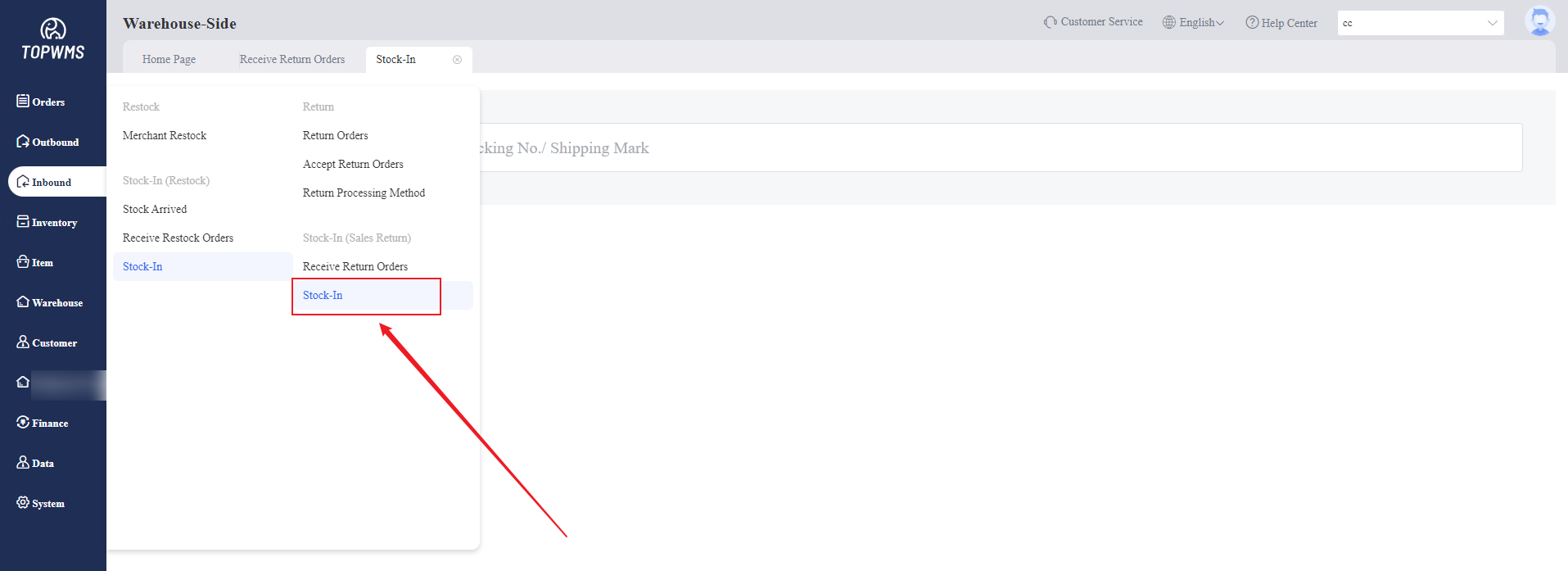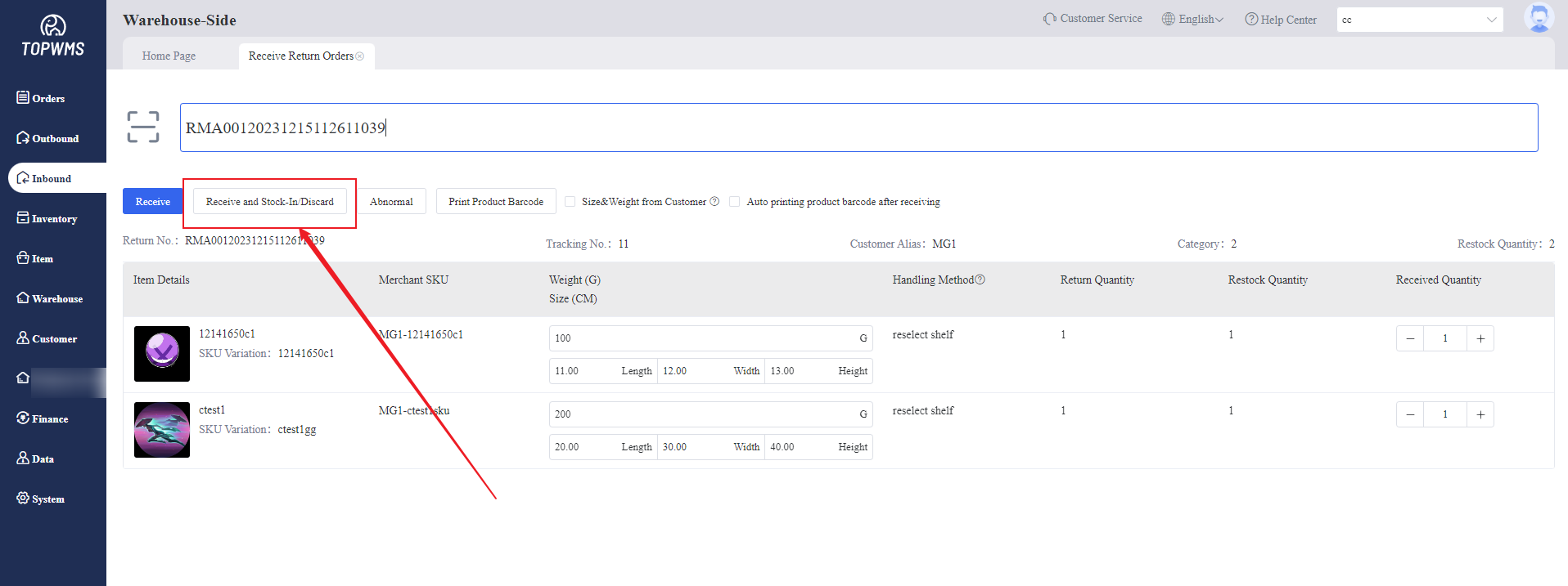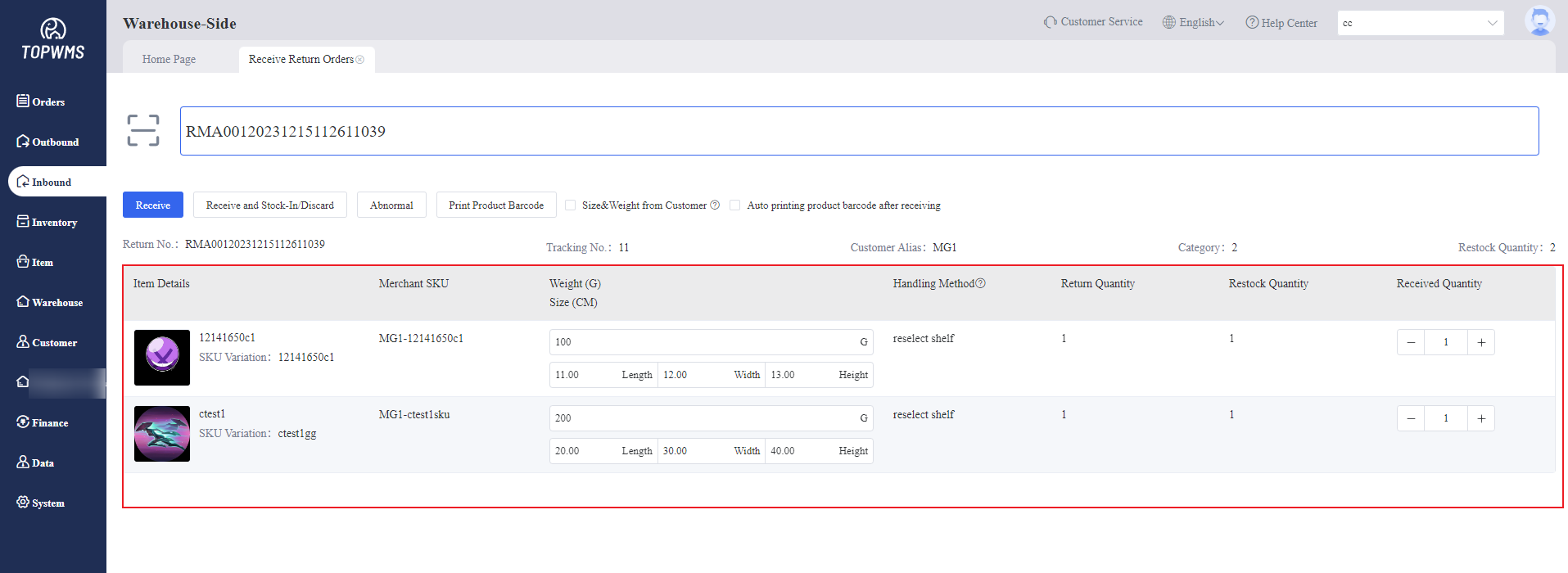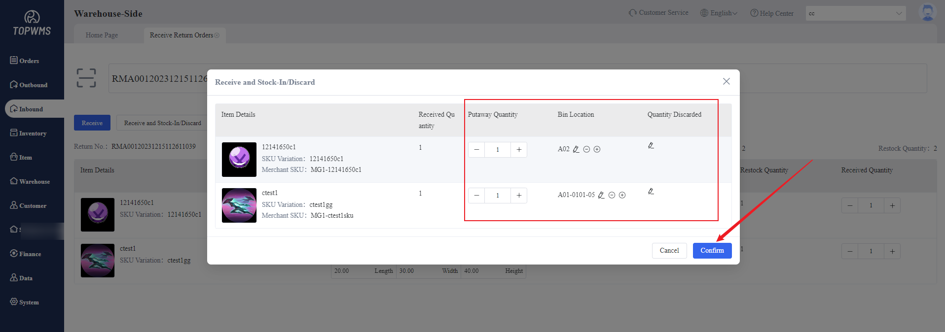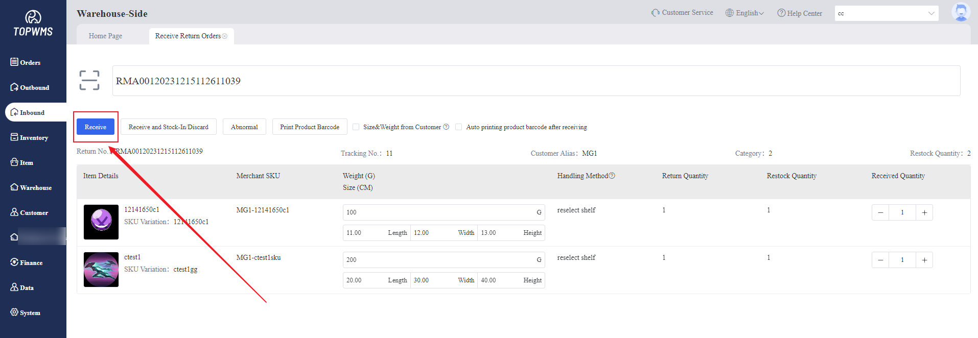 1. After the merchant submits a return order on the merchant-side, when the return package is returned to the warehouse,the warehouse needs to receive return order and stock the items in the warehouse.