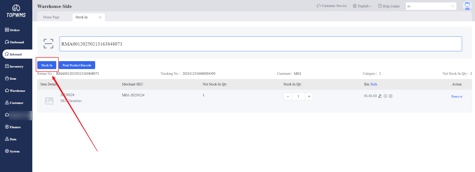 Enter [Inbound] > [Stock-In] page > Scan the return number > Check the information and quantity of items > Click [Stock-In] > Stock of items are increased