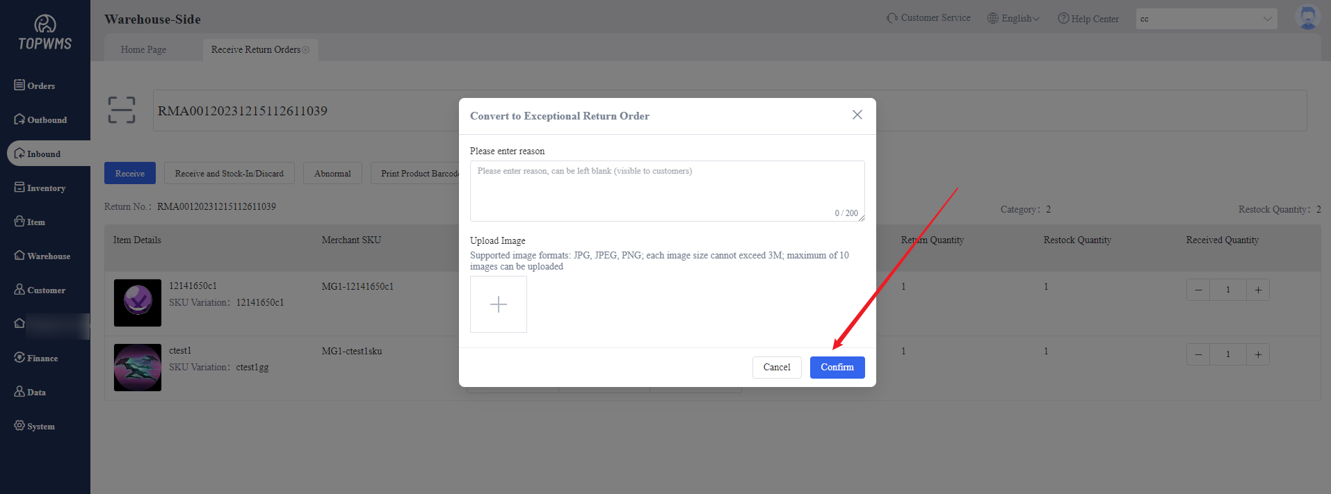 Click [Abnormal] > Enter the abnormal reason in the pop-up window, and a picture can be uploaded > Click [Confirm], the return order will be moved to ‘Abnormal’ status