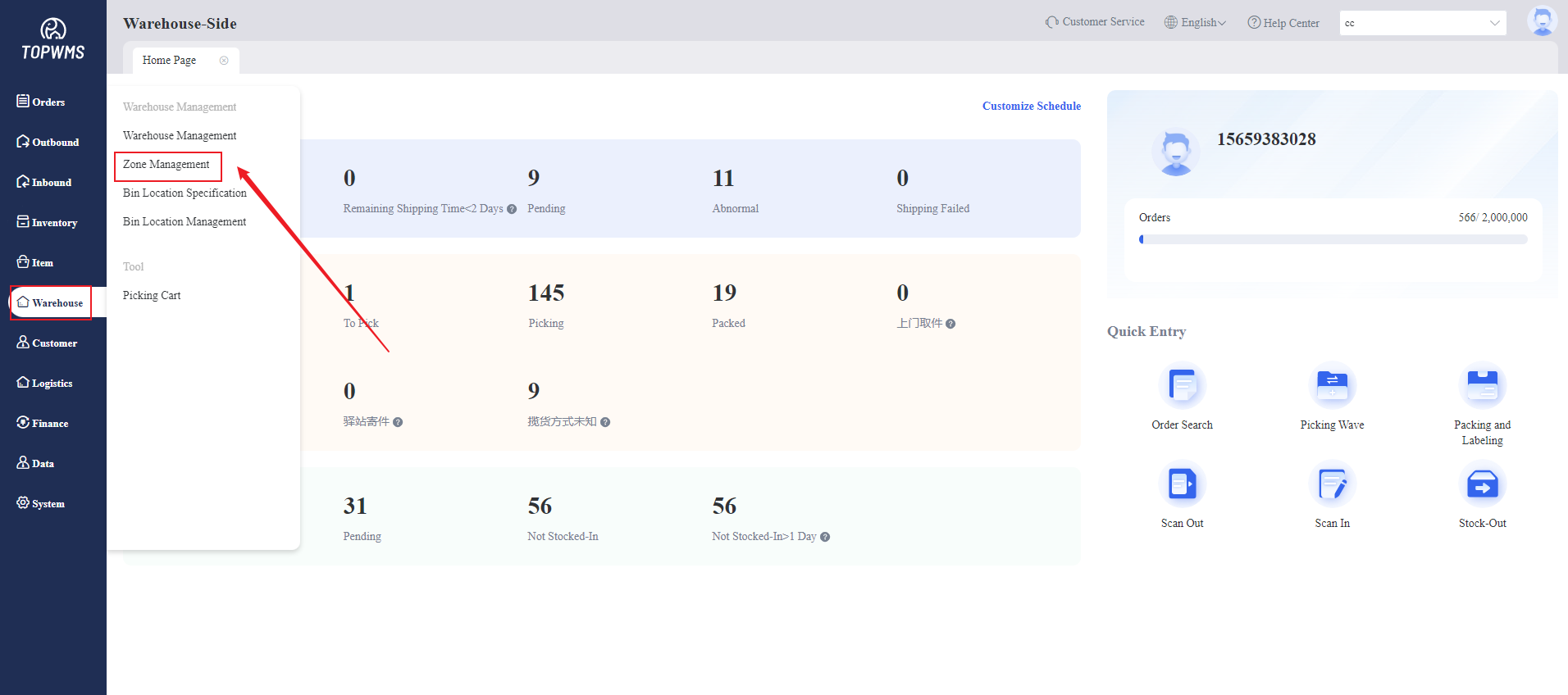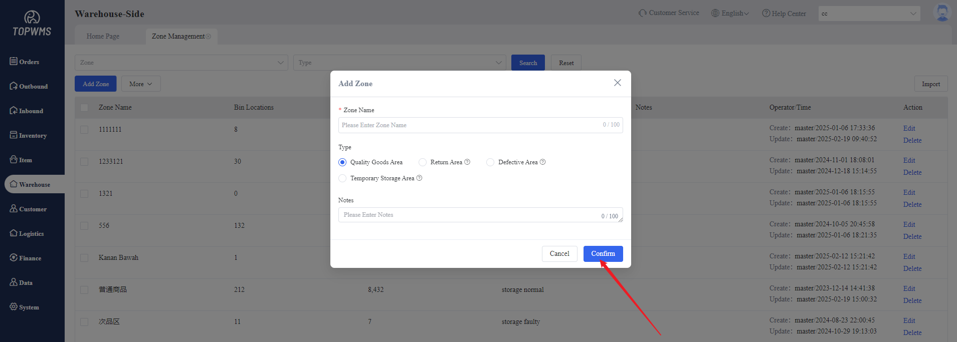 Set Warehouse Zone, Click Warehouse > Click Zone Management > Click Add Zone