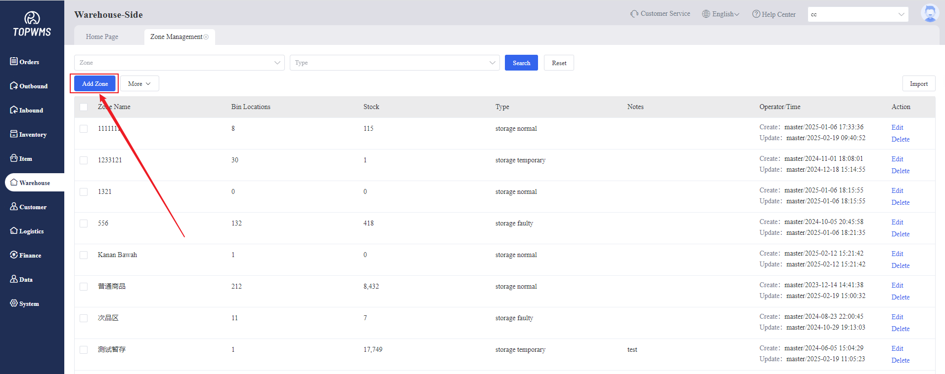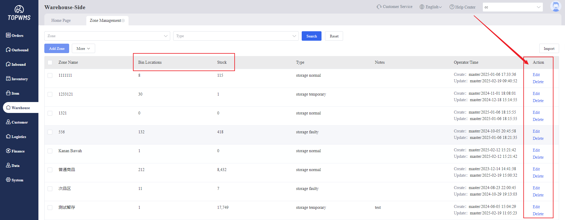 3. The number of bin locations and stock in each zone can be viewed in the interface, and secondary editing and deletion of zones are supported.