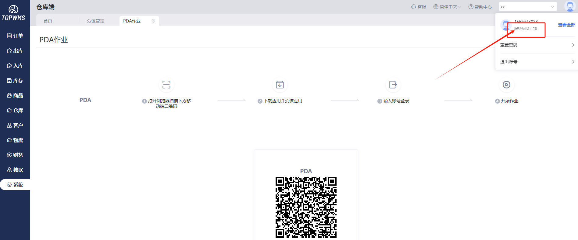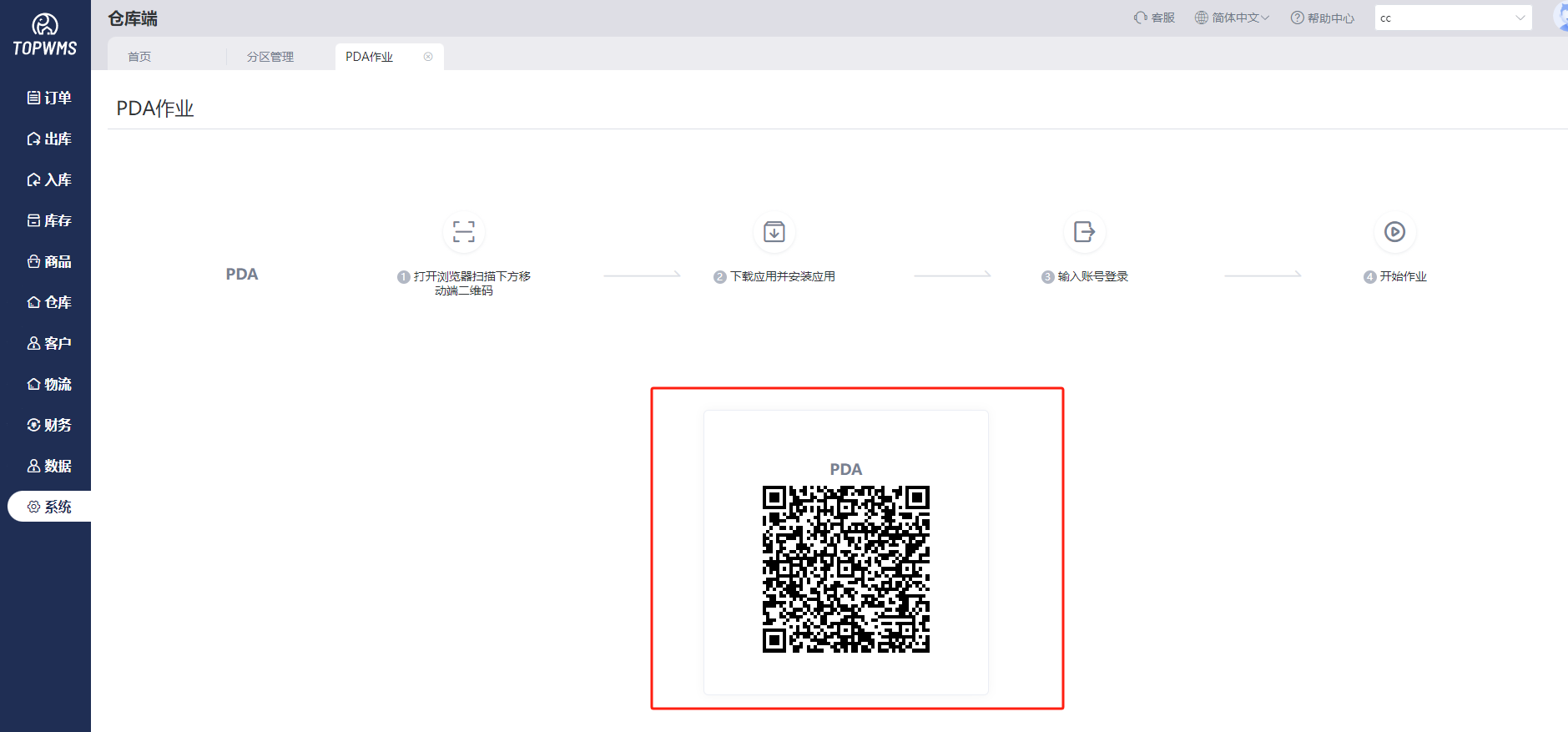 ①进入系统=>PDA作业,使用PDA,打开浏览器并扫描页面中的二维码,下载软件