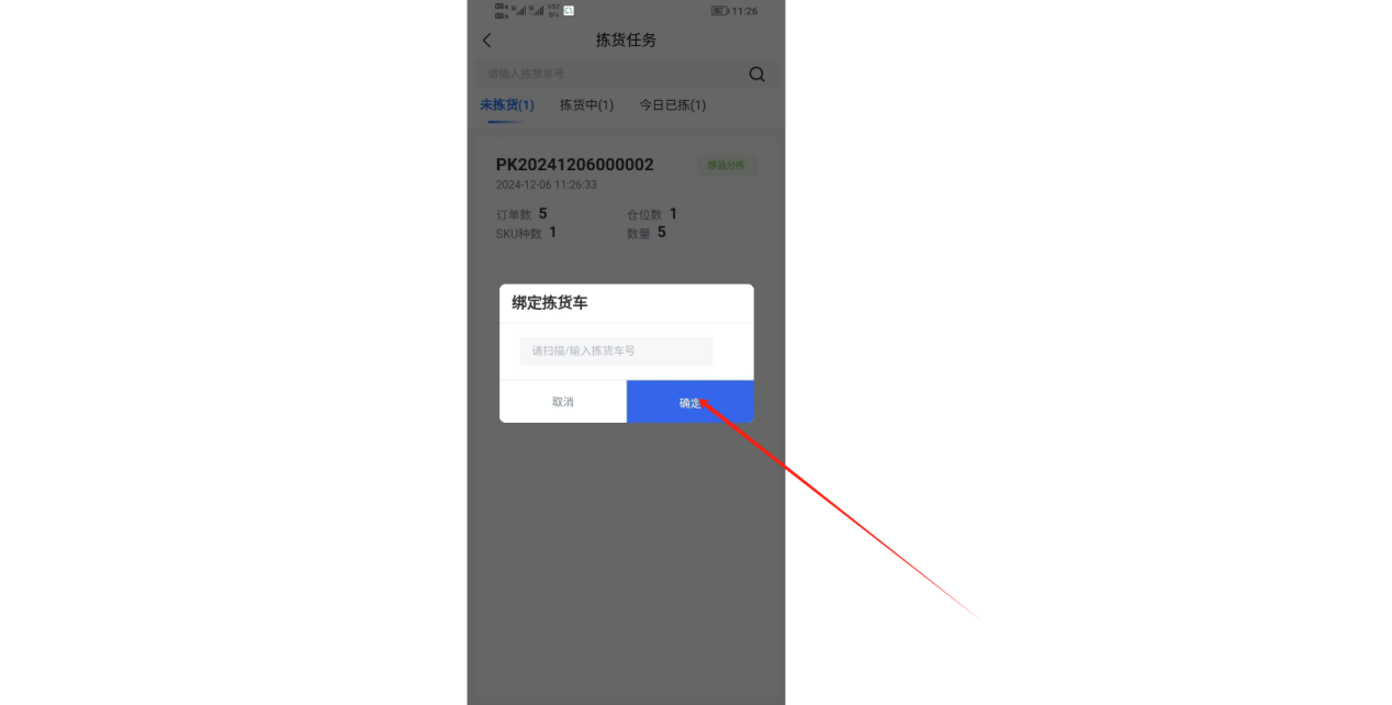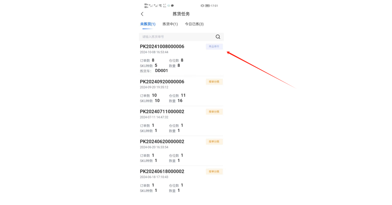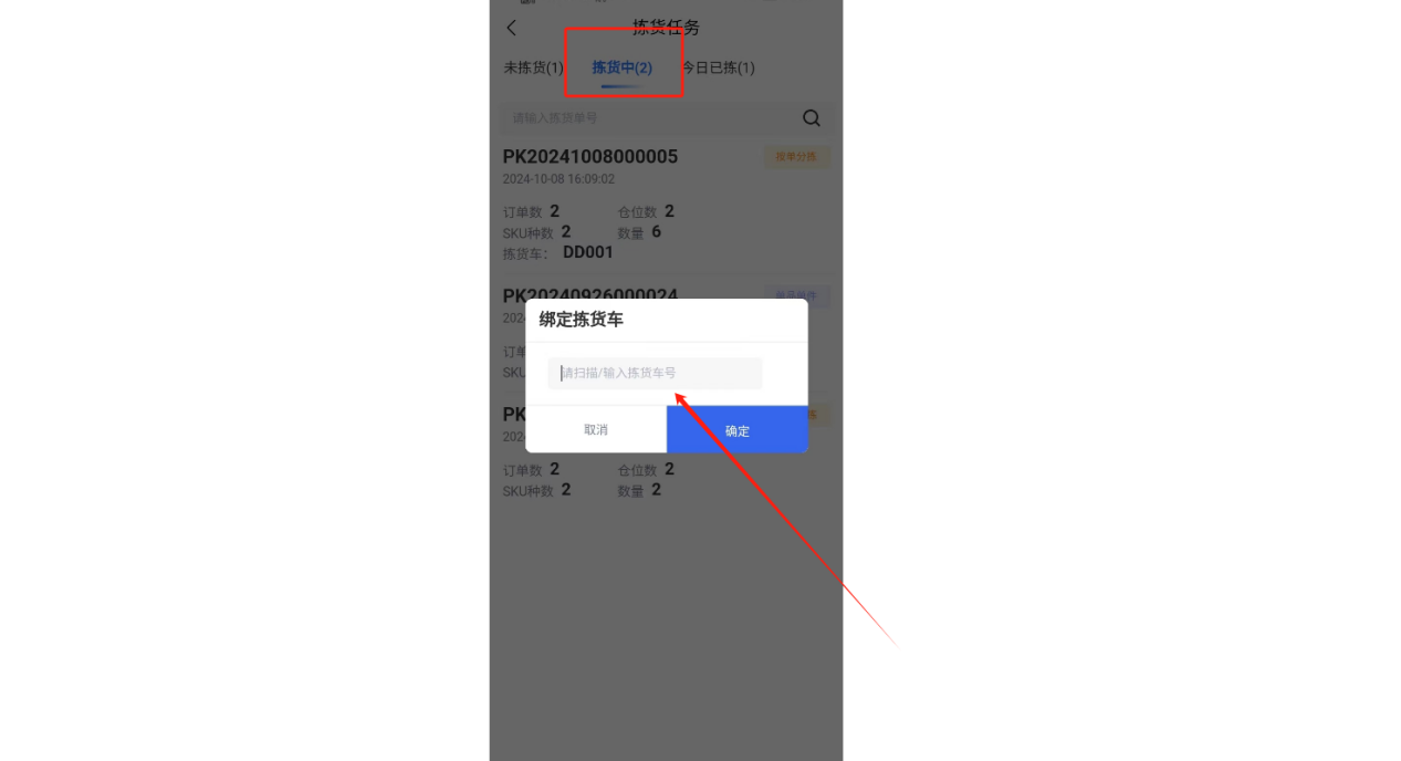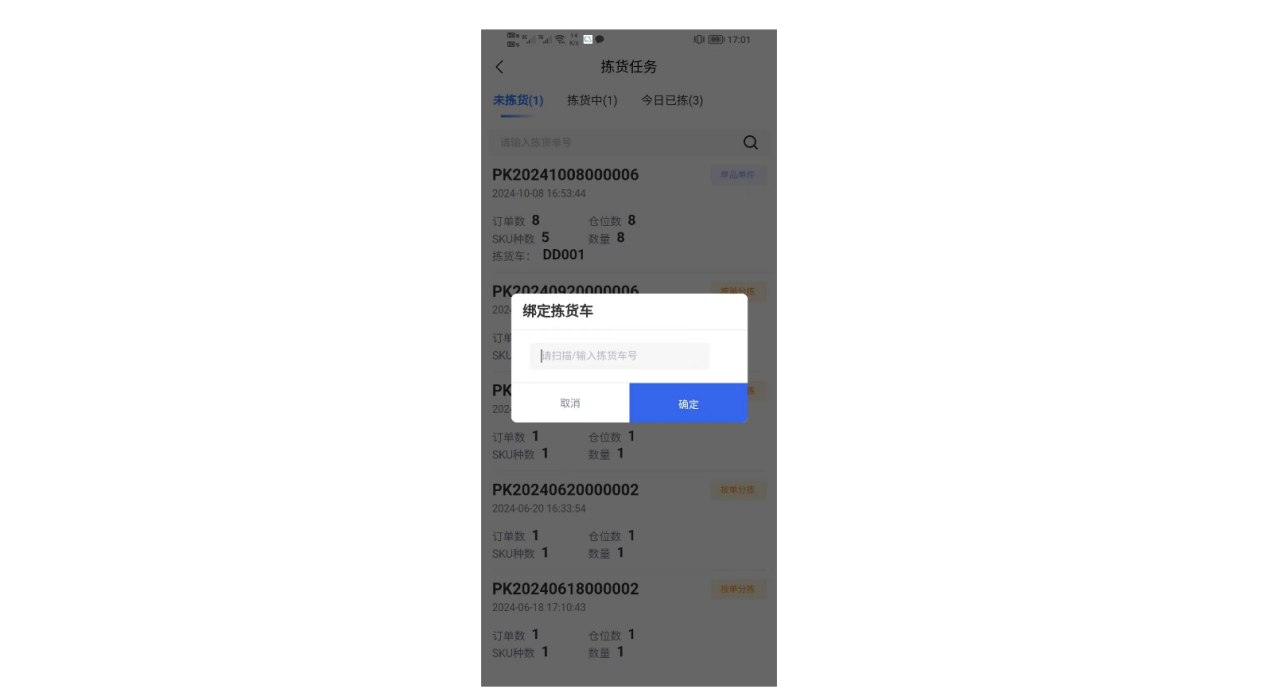 ①进入拣货任务,找到需要拣货的单品单件订单,扫描绑定拣货车