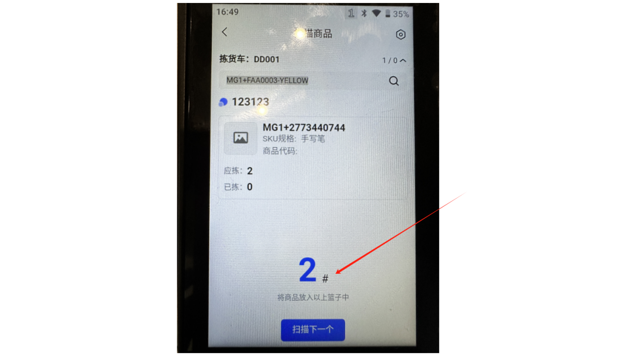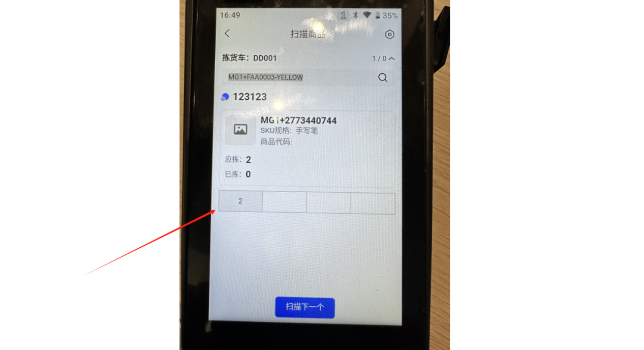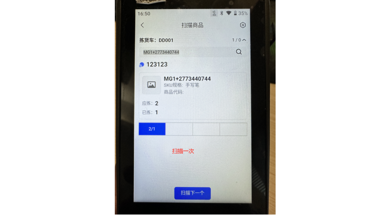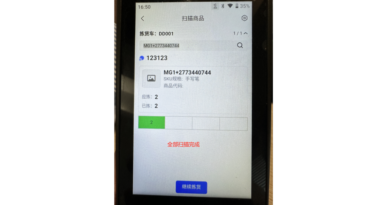 ②绑定拣货车之后,会进入到扫描页面,可以看到这个波次需要拣货的商品,直接扫描商品SKU条码拣货即可