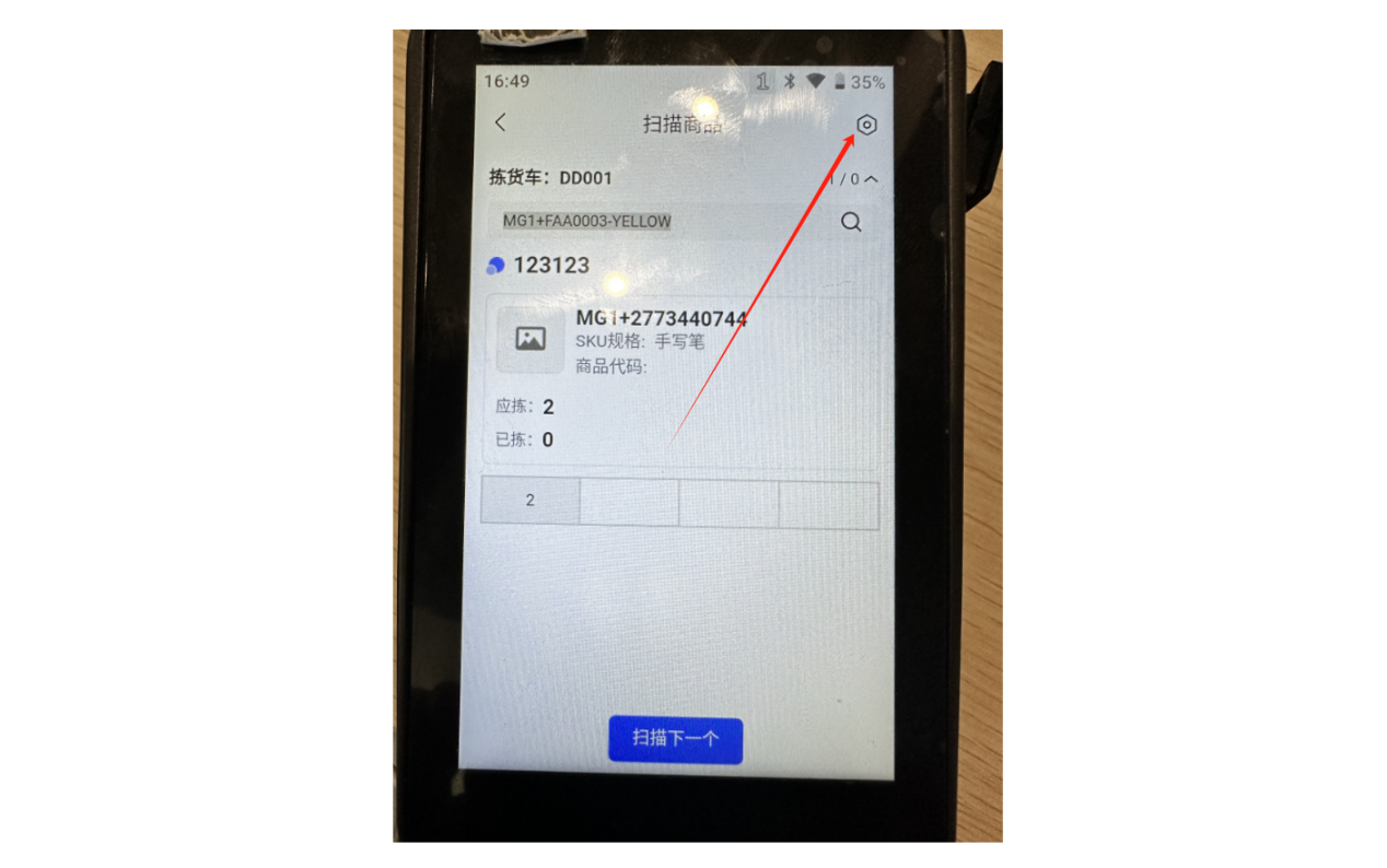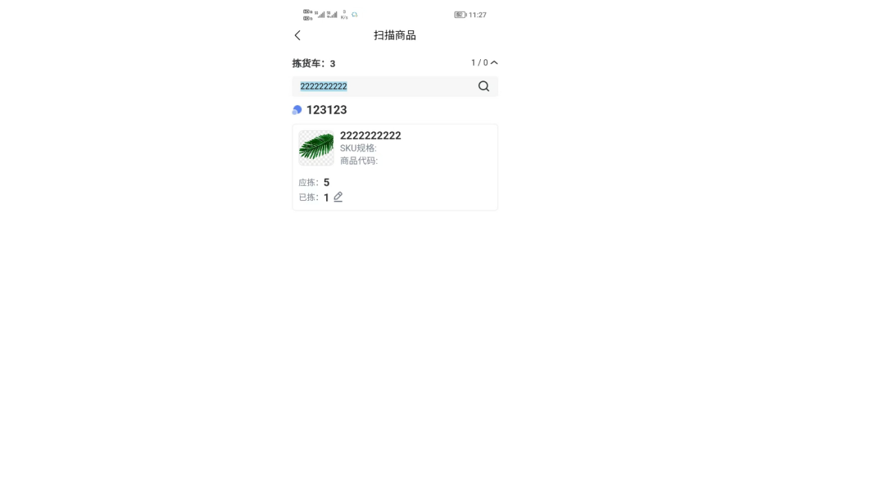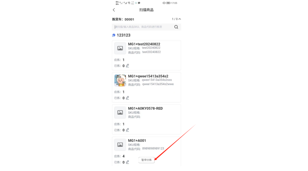 ②绑定拣货车之后,会进入到扫描页面,可以看到这个波次需要拣货的商品,直接扫描商品SKU条码拣货即可
