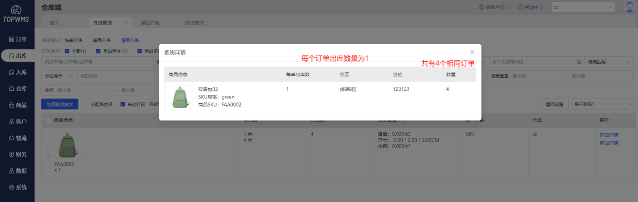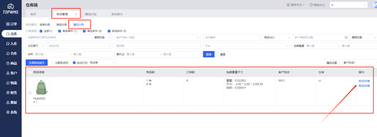 ①在pc端=>出库=>拣货管理=>爆品分拣中,满足爆品条件的单子会自动移入爆品拣货状态,可点击【拣货详情】、【商品详情】查看详细信息