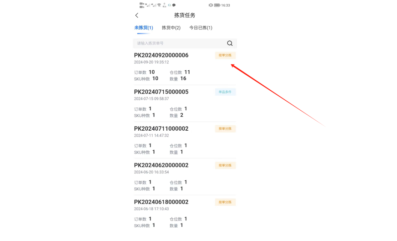 ①进入拣货任务,按单分拣目前适用边拣边分的模式,无法暂停拣货