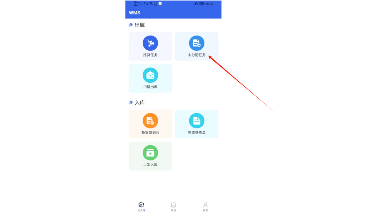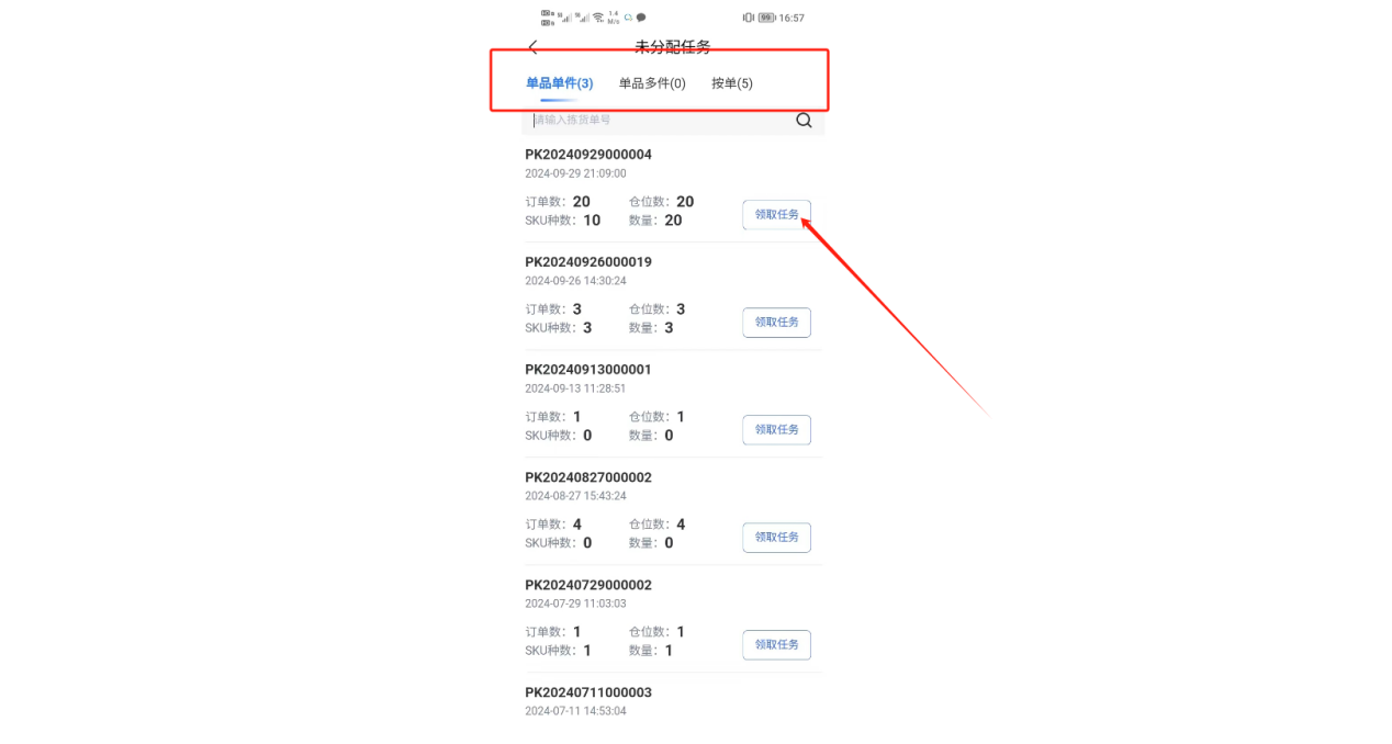 ①在出入库页面中,点击【未分配任务】,根据单品单件、单品多件、按单分拣、爆品分拣四种模式,领取拣货任务。