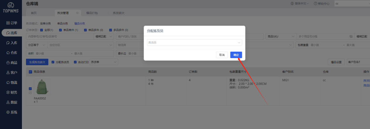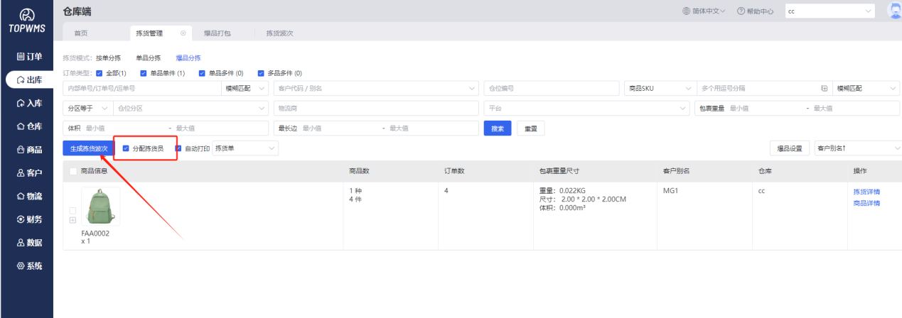 ②选择订单,勾选“分配拣货员”,点击【生成拣货波次】