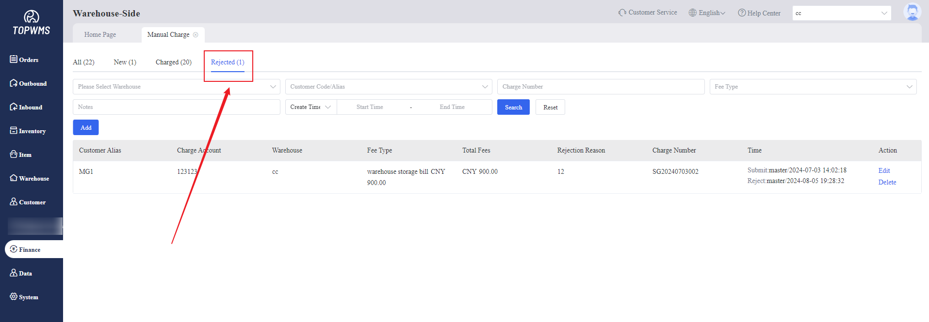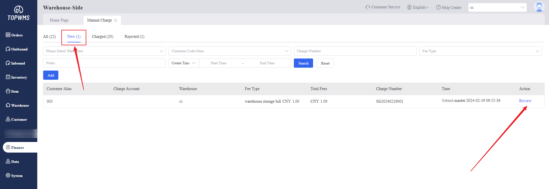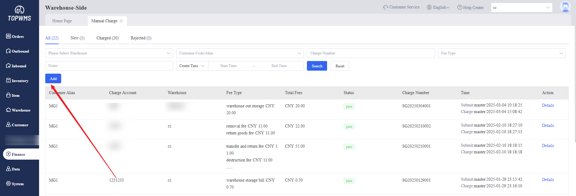 (1) When the warehouse needs to charge customers additional fees, go to [Finance] > [Charge] > [Manual Charge] and click [Add].