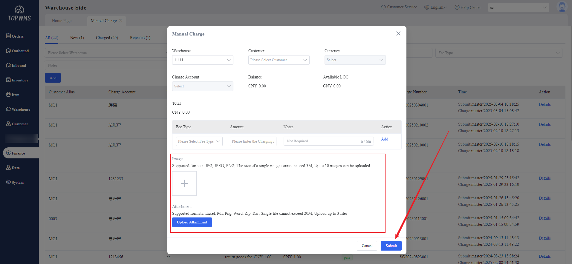 (2) Set the details of charge in the pop-up window. Uploading transfer pictures and attachments are also supported. After filling in, click [Submit].