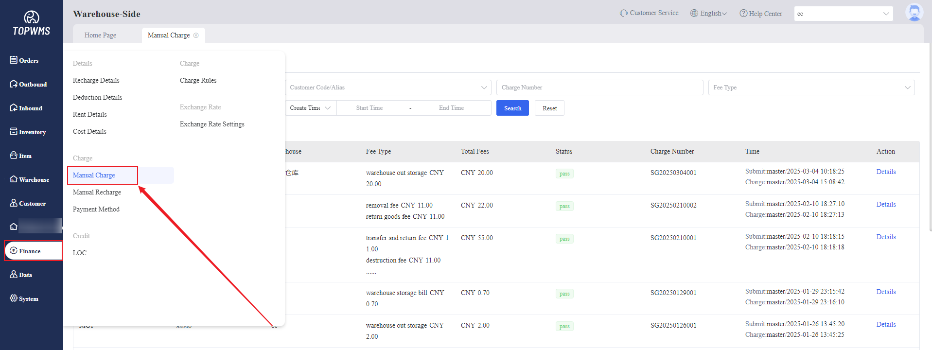 2. If the warehouse needs to charge merchants additional fees, the [Manual Charge] function can be used.