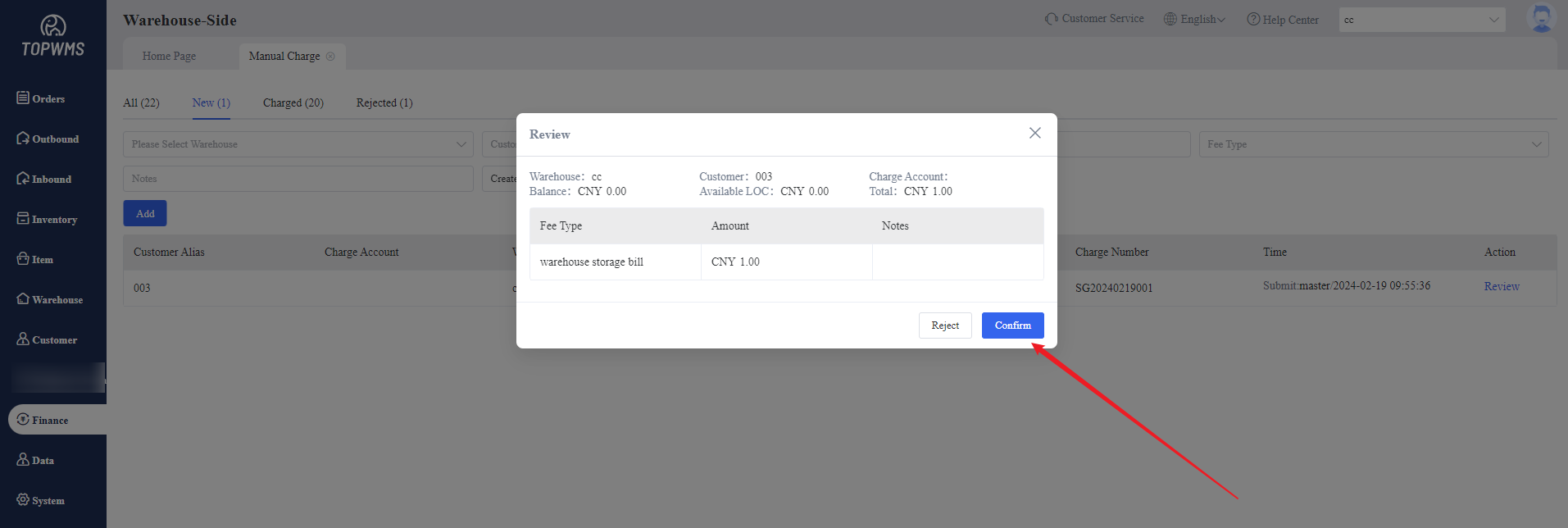 Then person in charge need to click [Review] on the “New” page and click [Confirm] in the pop-up window if there is no problem, which means the deduction is successful. The order will be moved to “Charged”.