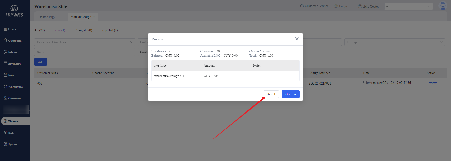 If there is a problem with the charge order, you can click [Reject] and the order will be moved to the "Rejected" status.