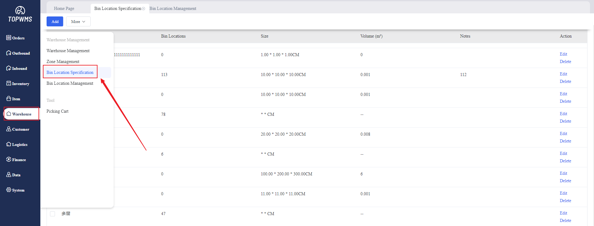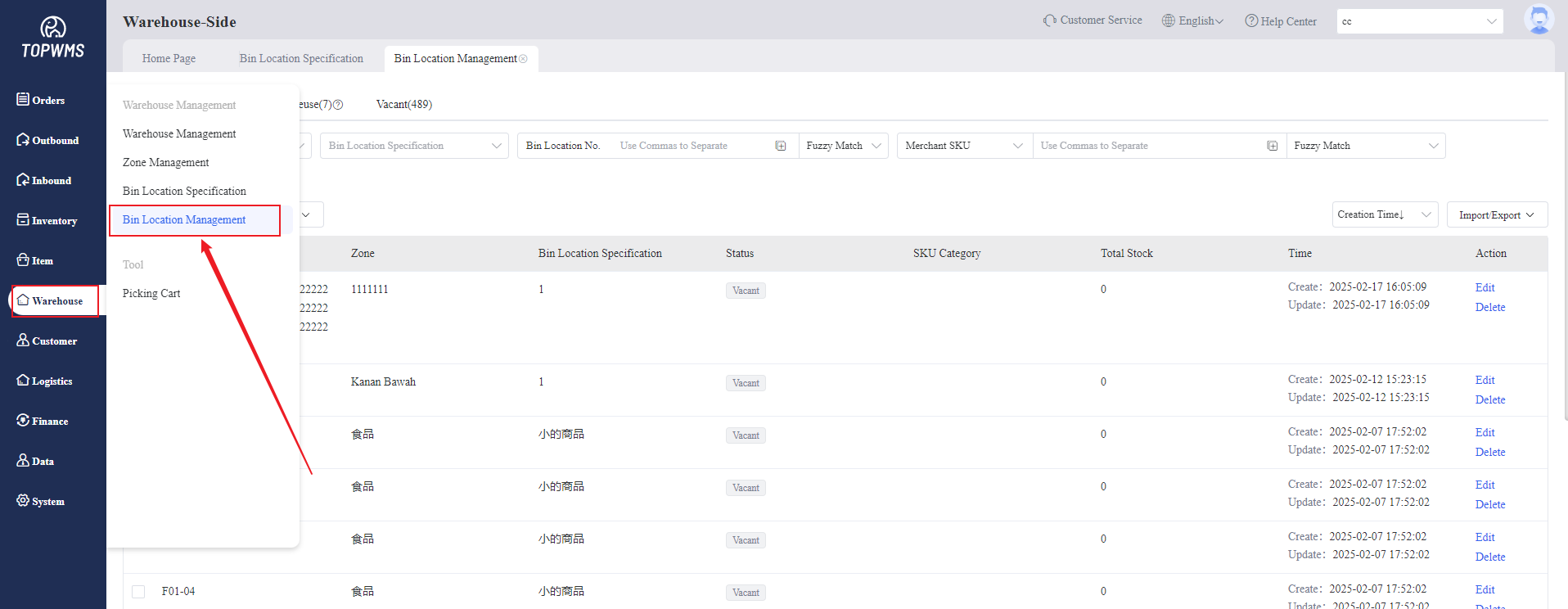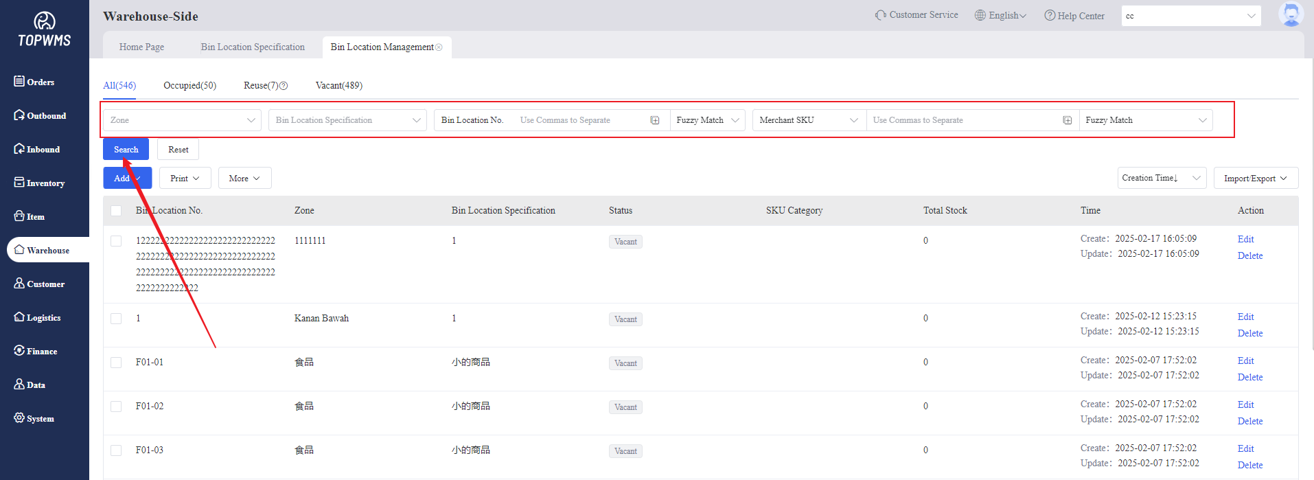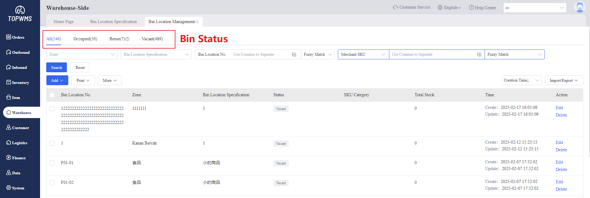 5. It also supports filtering bins by bin status or zone, specification, number, etc.