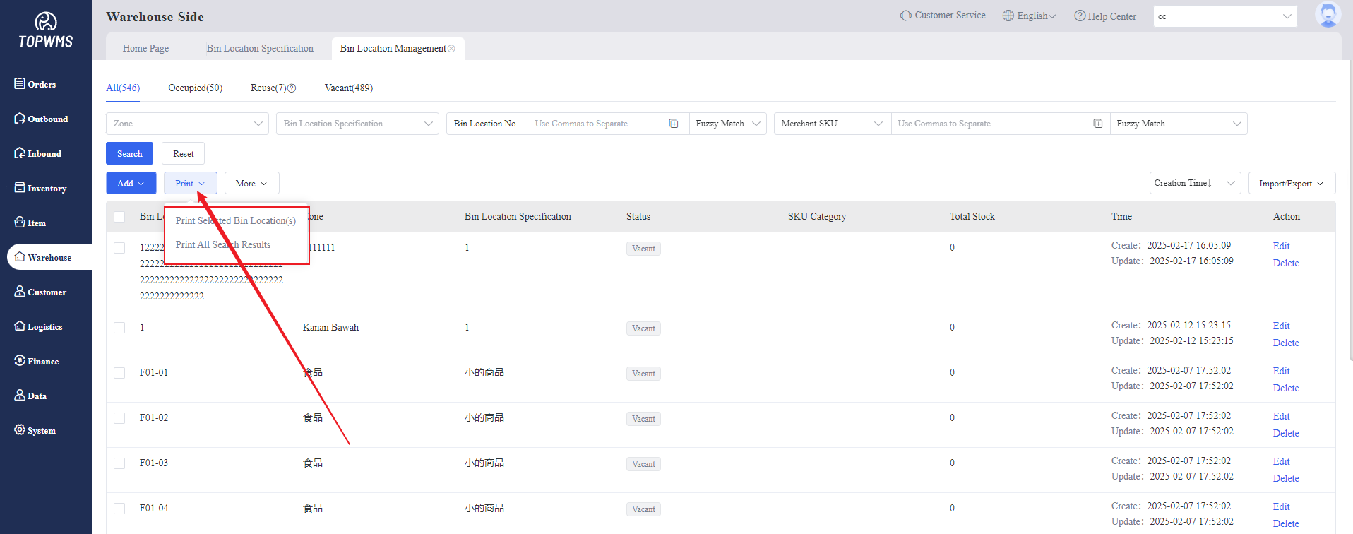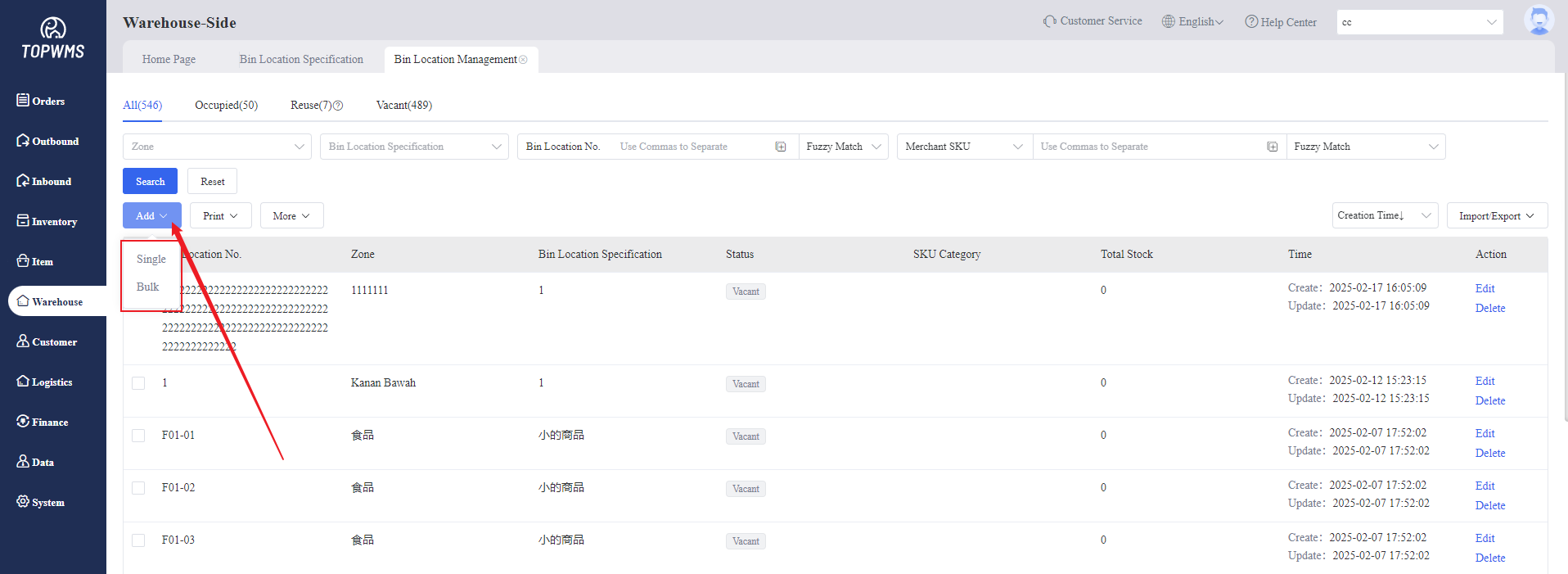 4. After the new bin is created, it will be displayed as "Vacant". After items are placed in it, it will be displayed as "Occupied". If the number of items in the "Occupied" bin becomes 0, the status of the bin will be displayed as "Reuse". This bin can be used to place other items.