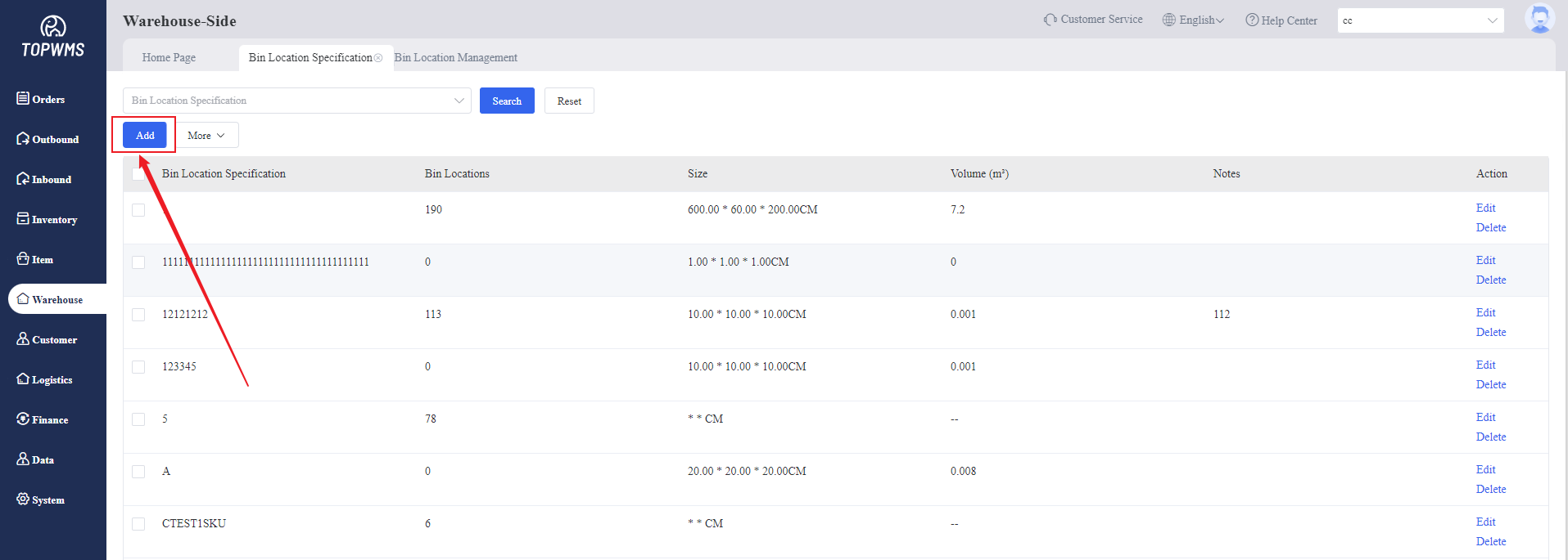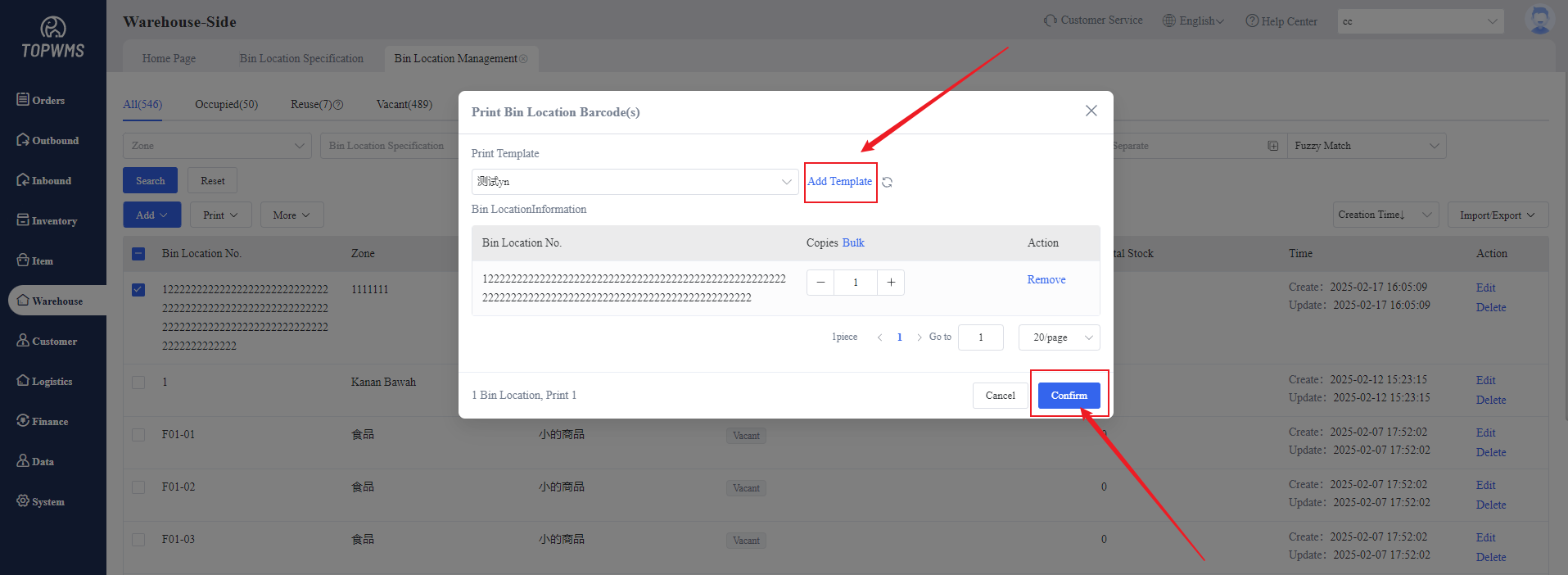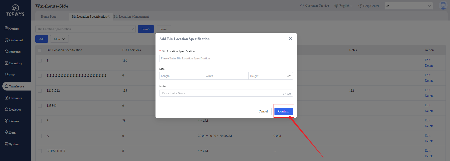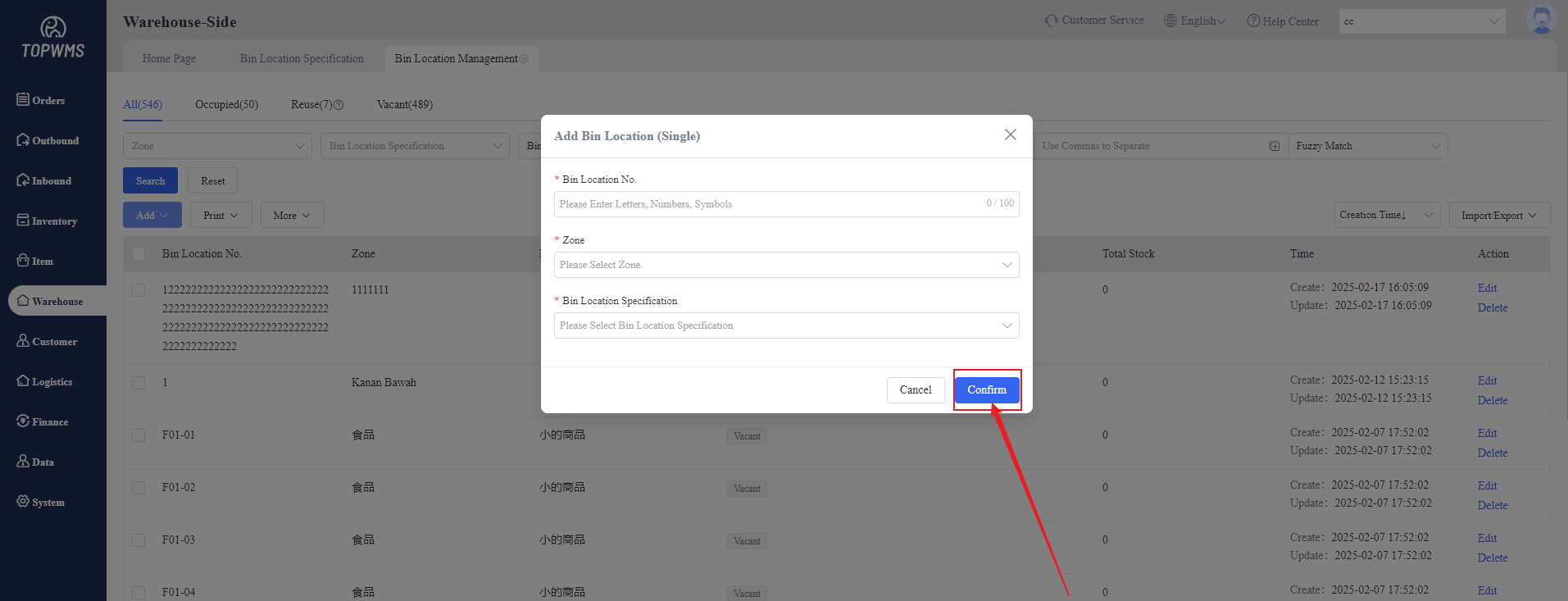 For a single addition, you need to directly customize the bin number, select the zone and bin specification, and click Confirm to generate the bin.