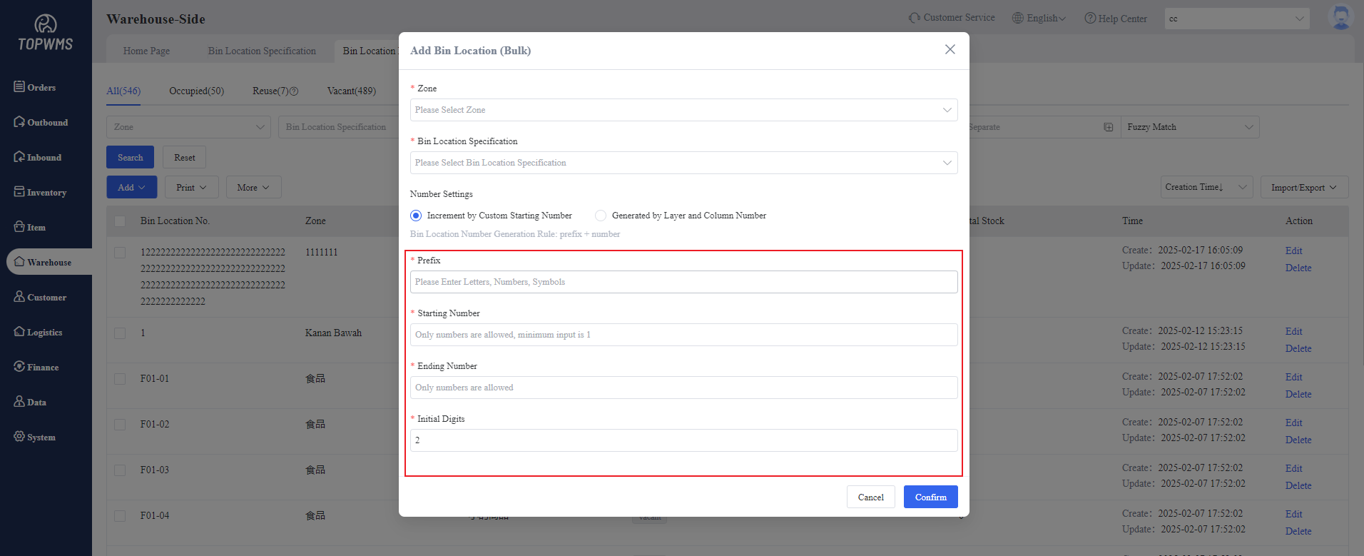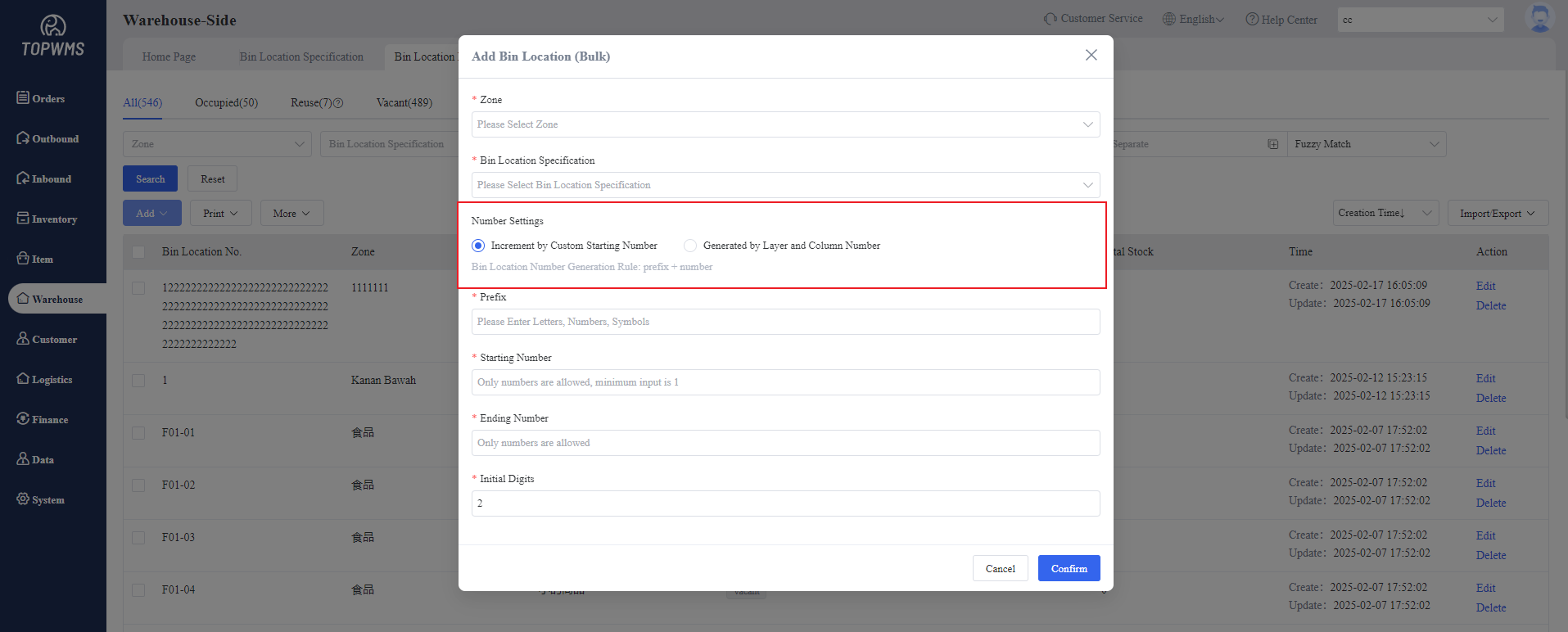 After selecting the zone and the specification, you need to set the numbering rule. The system will automatically generate the bin names according to the set rule. After setting the corresponding rules, Click Confirm