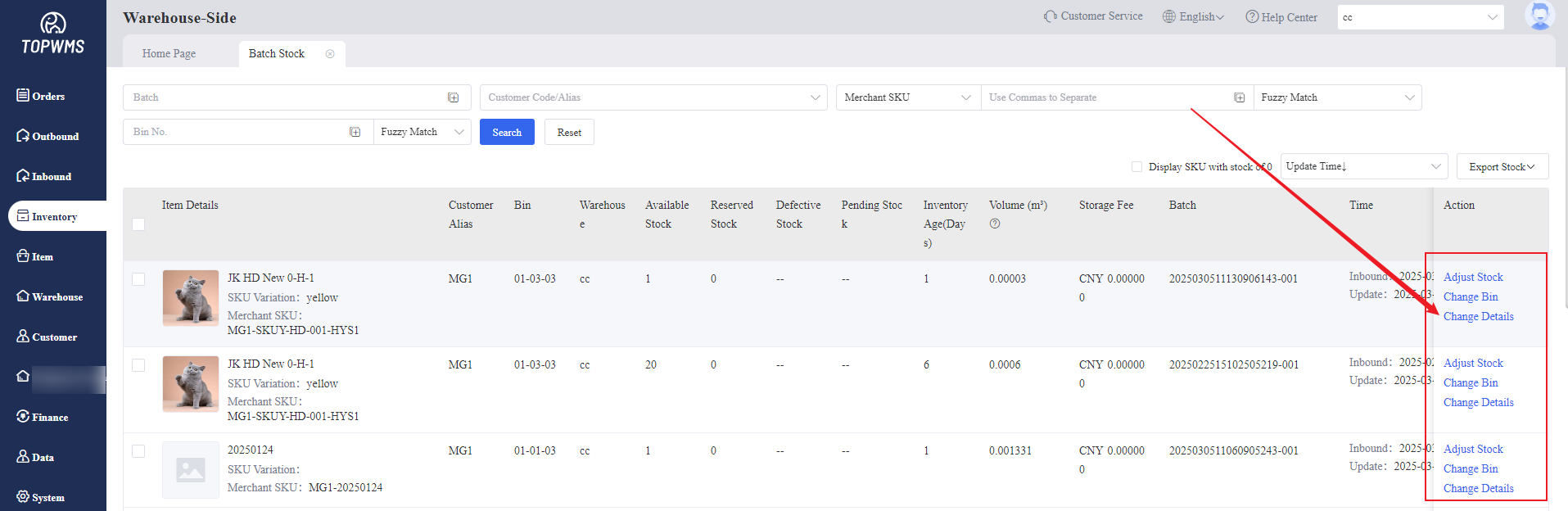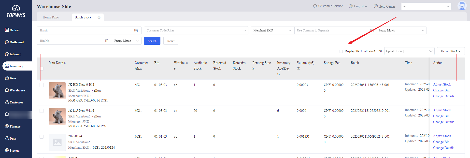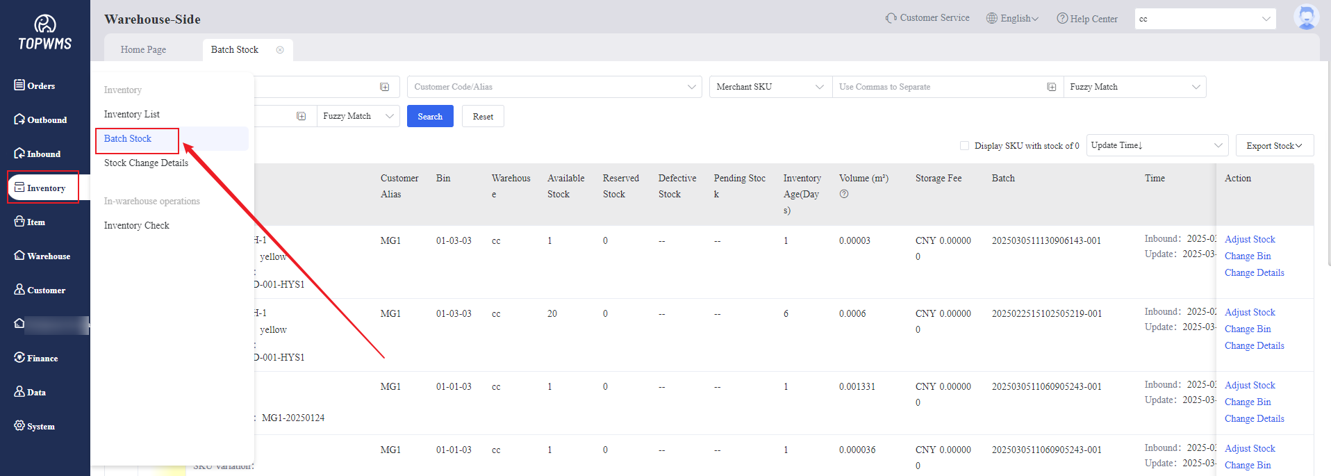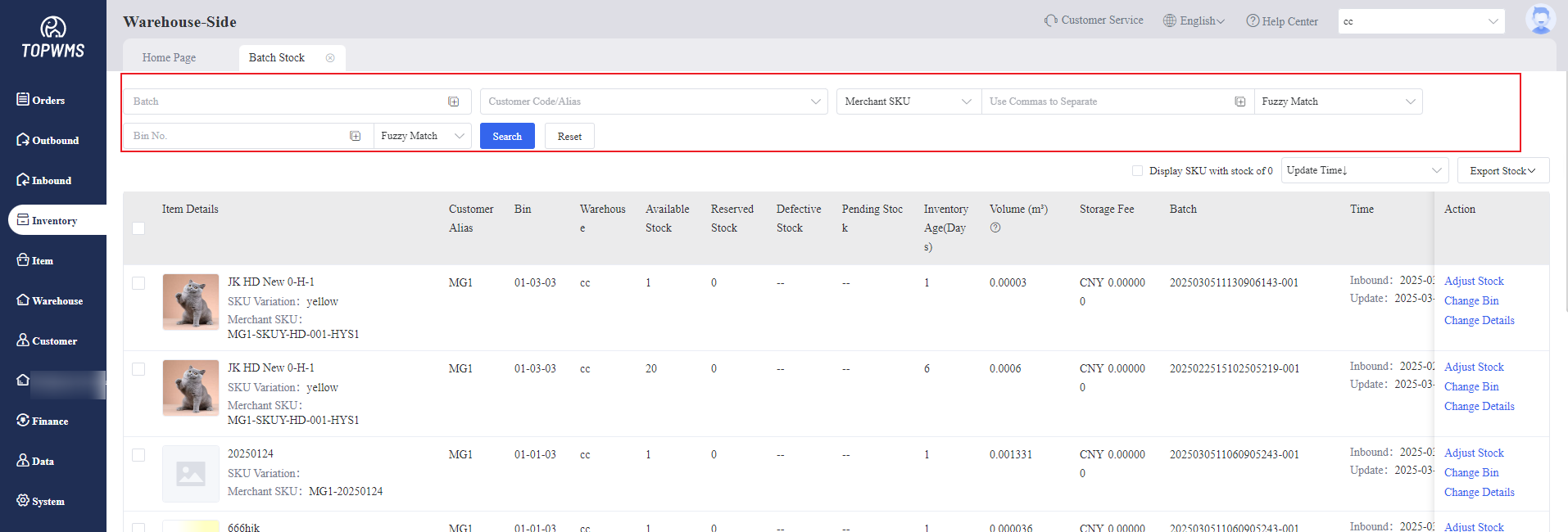 Items with the same Merchant SKU, same bin location and same stock-in time are defined as the same batch. You can search for items in the same batch by searching for batch, customer, or Merchant SKU.