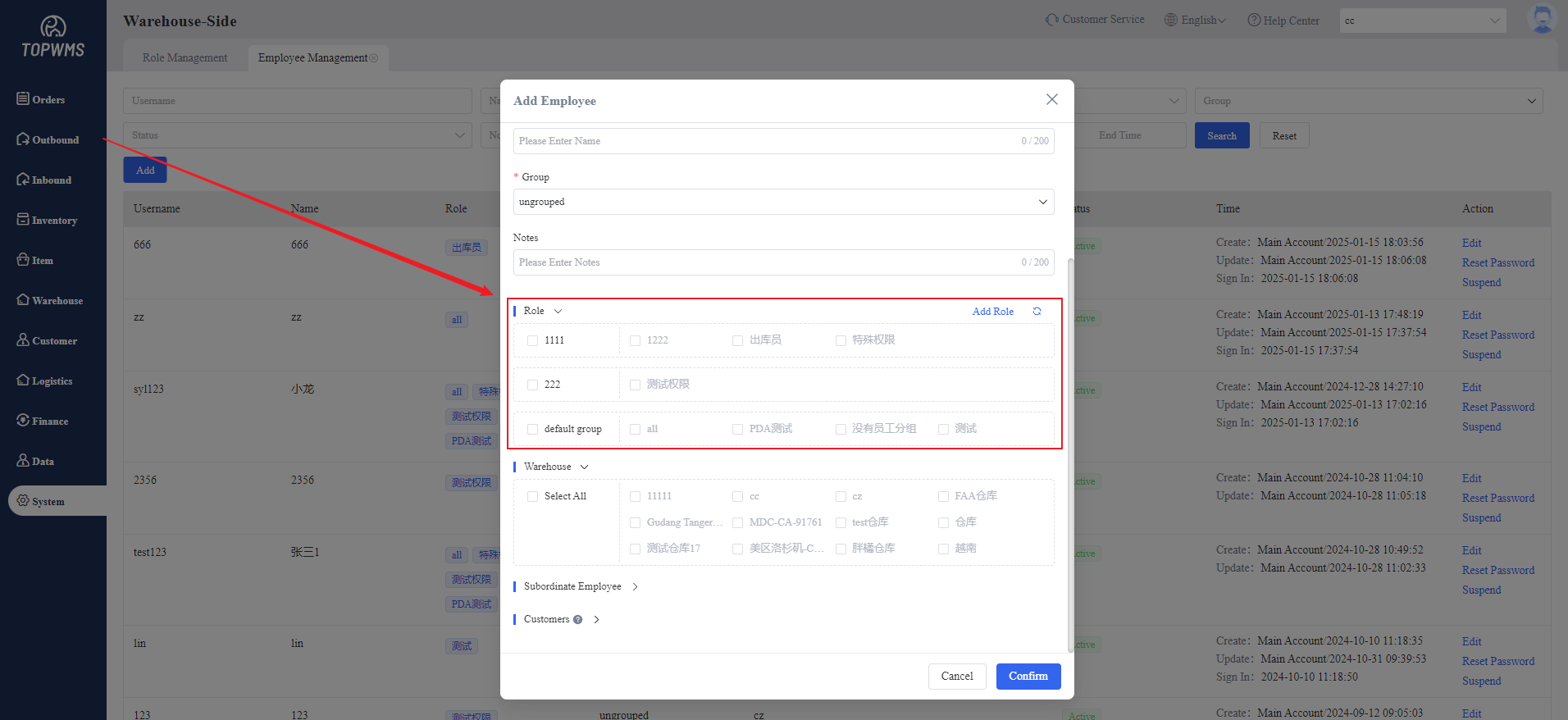 (4) Permissions: Set the permissions that the role can use. According to the functional modules, they are divided into home, order, outbound, inbound, etc. After checking the module, you can also check the specific functions. After setting, click [Confirm] to create the role.