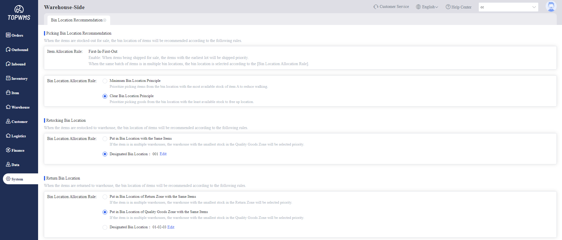 1. Set the bin location recommendation rules in advance. When items are stocked-out(sale), stocked-in(restock), stocked-in(return), etc., the system will recommend bins according to the set rules. The warehouse can choose whether to place the bin according to the actual situation.