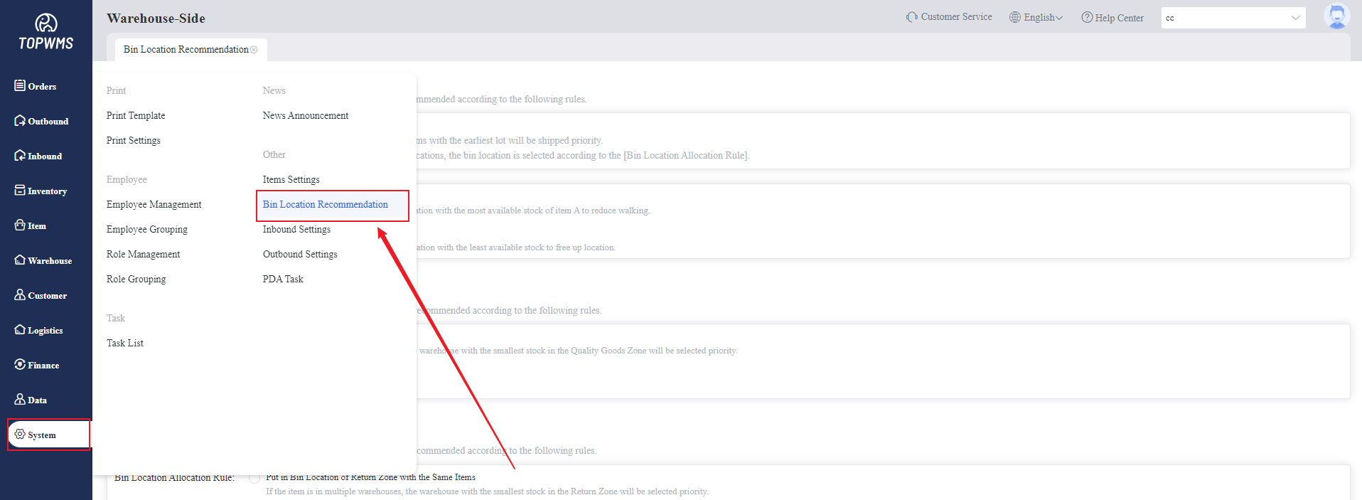 1. Click [System] > [Bin Location Recommendation]