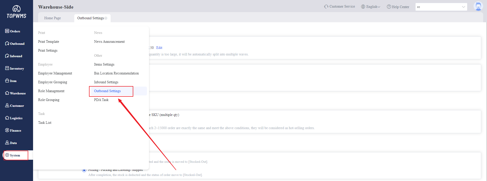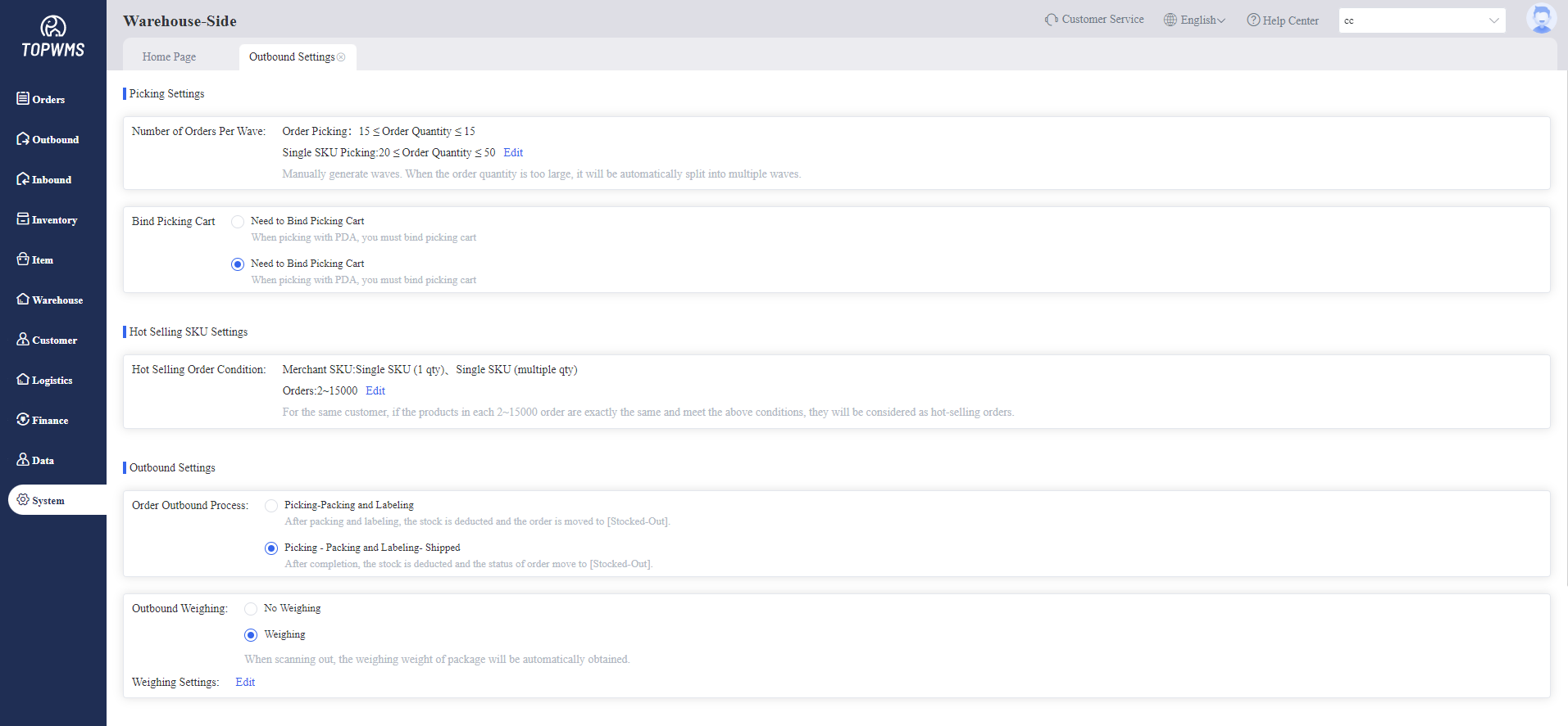 1. This function is applicable to the warehouse when the goods are stocked out. The warehouse can customize the outbound rules, such as selecting the outbound process, whether weighing is required, interception conditions, etc.