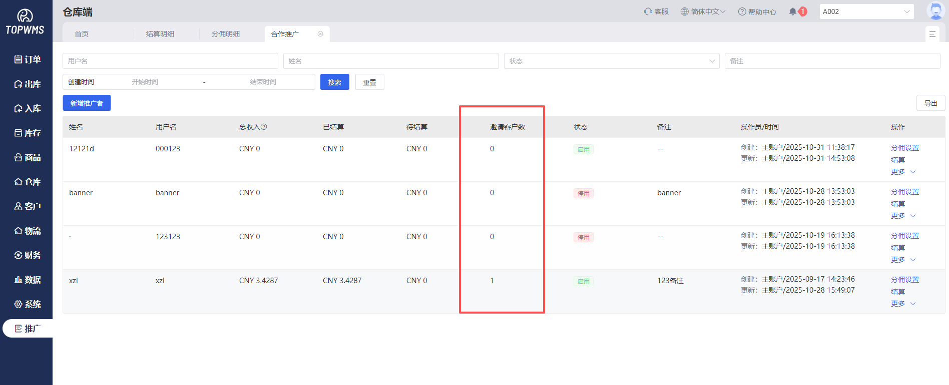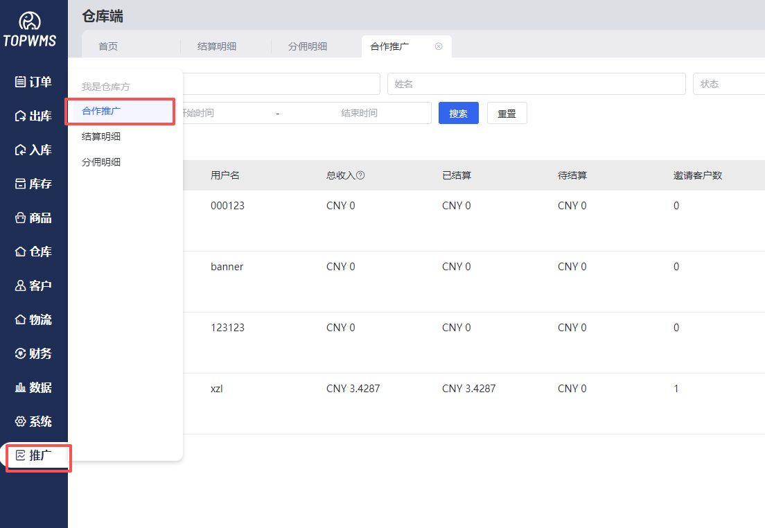 推广者通过专属的邀请链接,邀请客户注册了TOPWMS仓库端系统后,仓库可在推广=>合作推广的位置中查看目前推广者已邀约的客户数