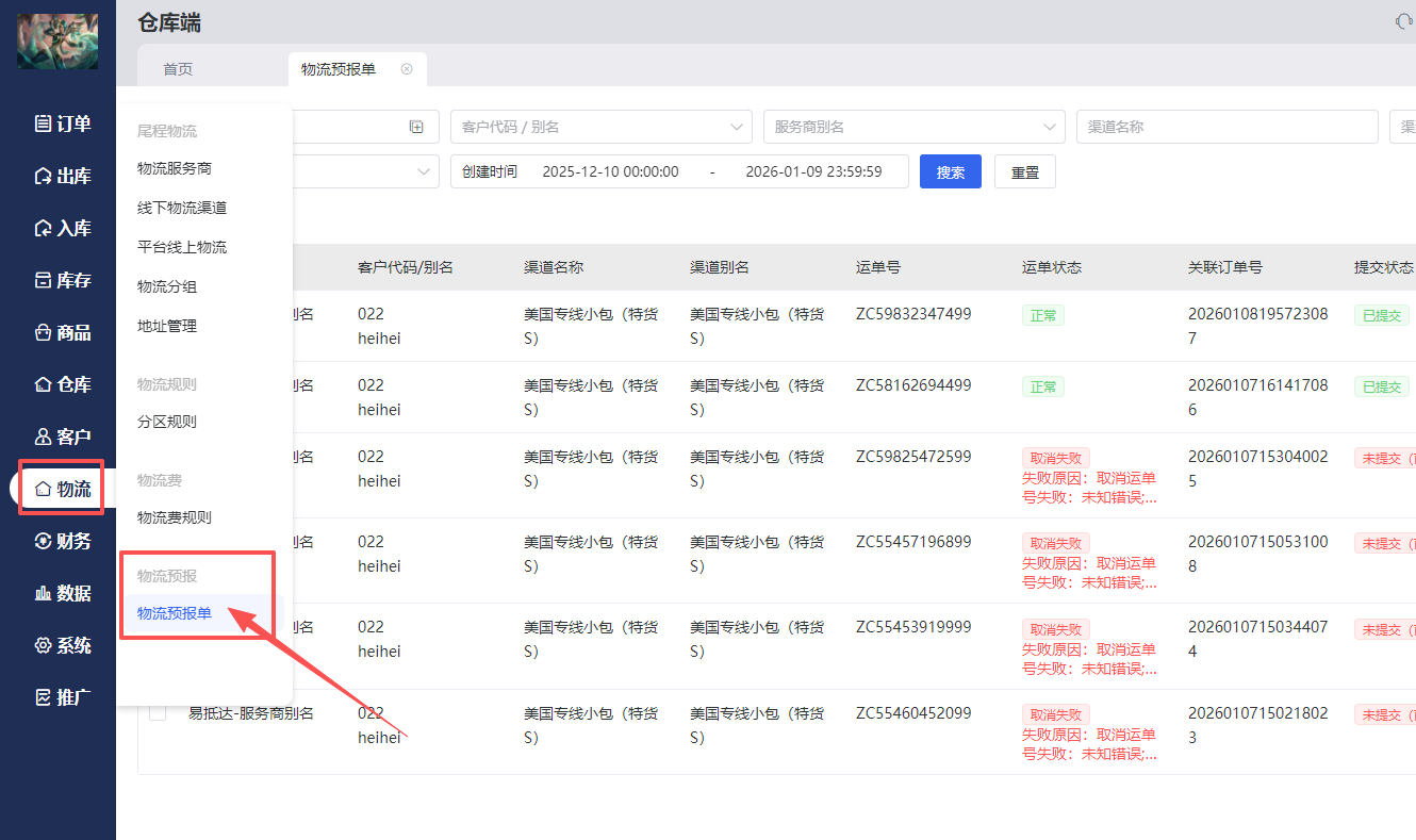 1、仓库进入WMS仓库端=>物流=>物流预报单