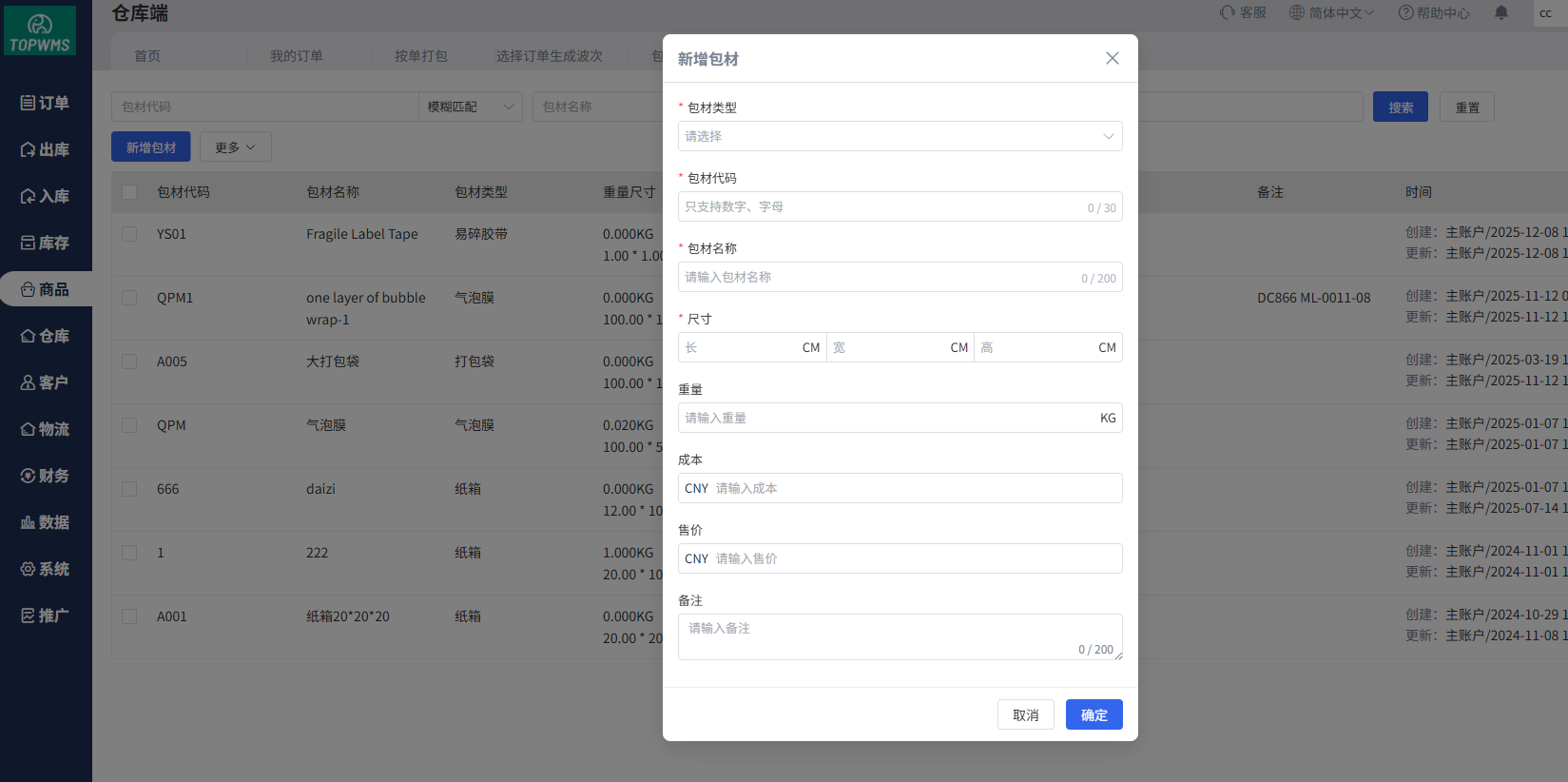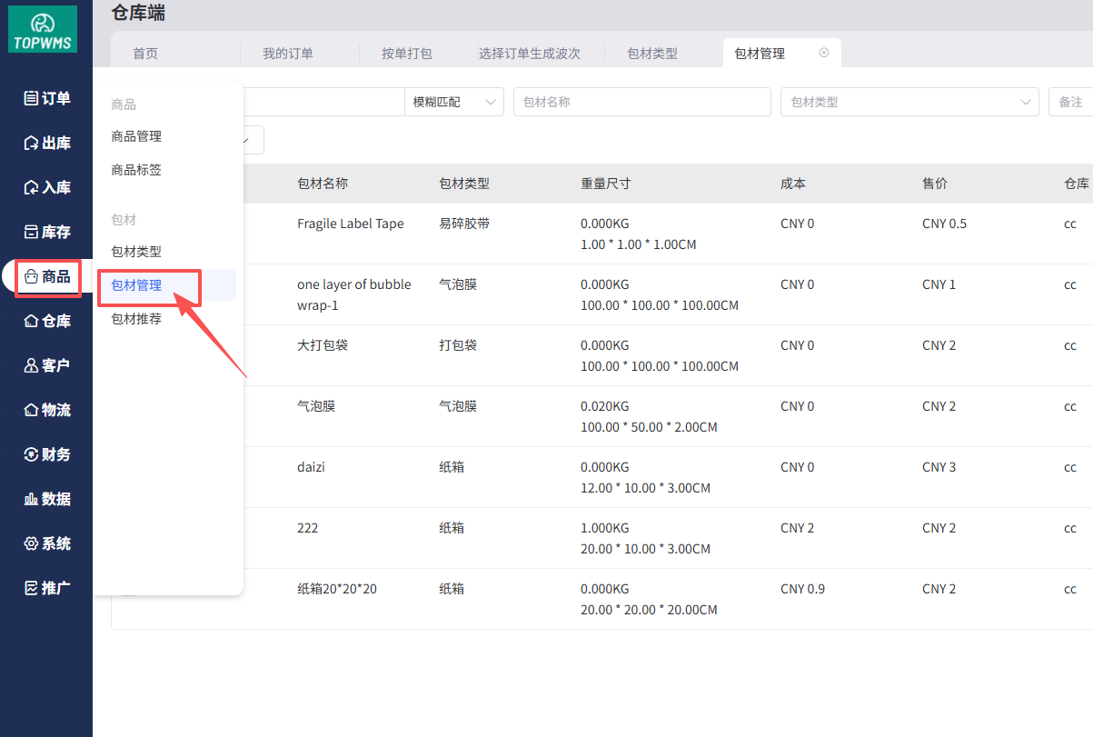 (2)进入包材管理中创建包材,录入包材信息,并将包材加入包材类型中,即可在打包时添加使用包材