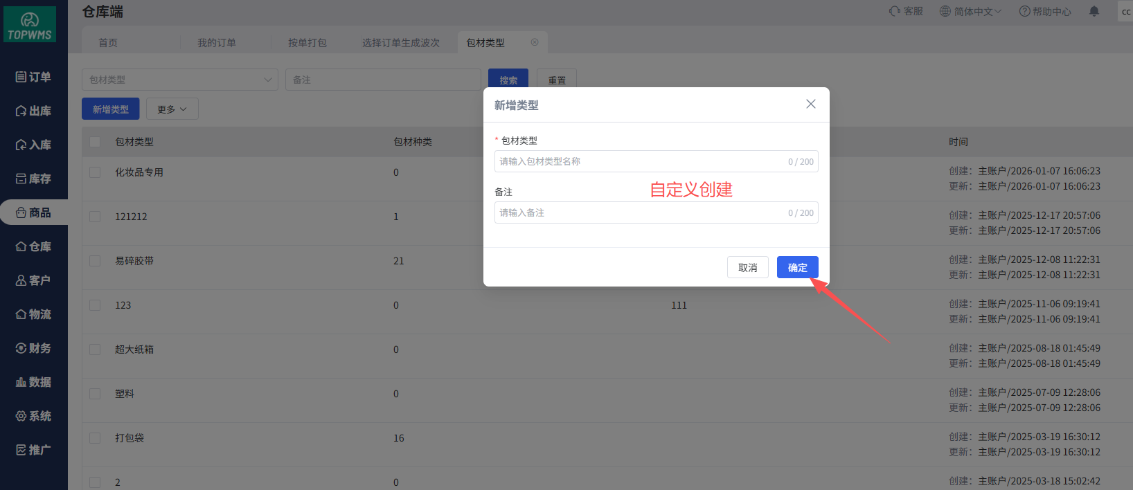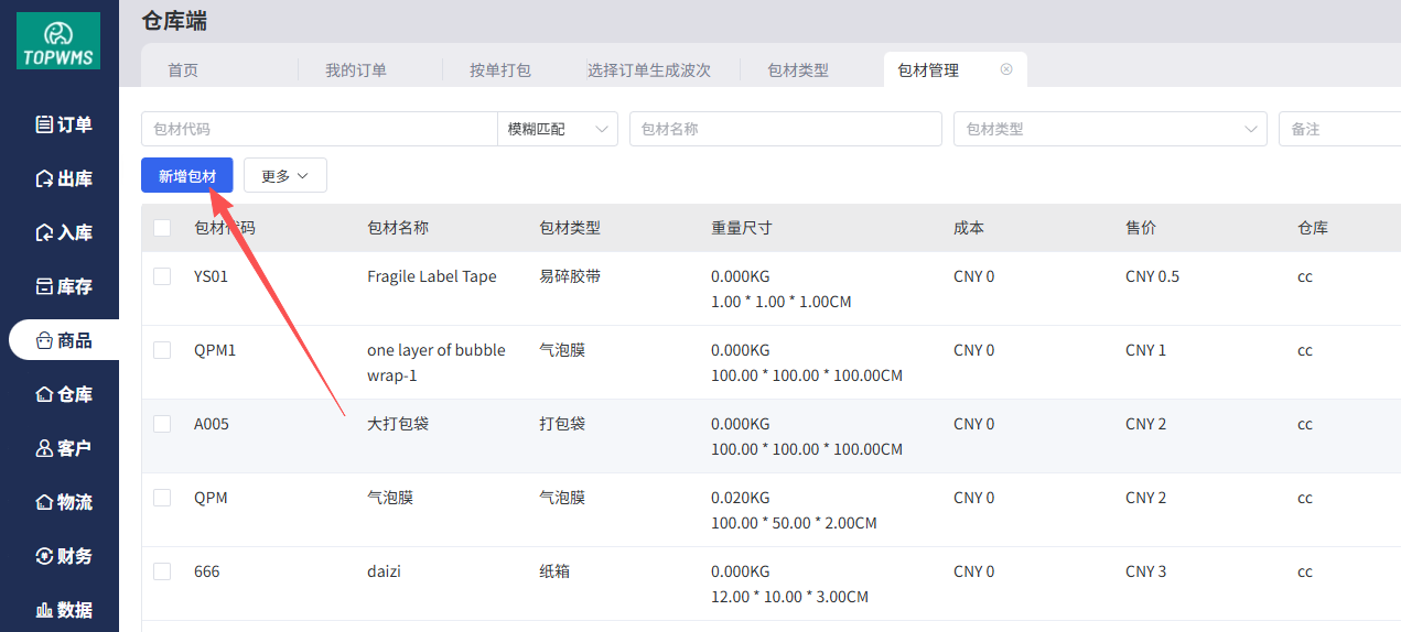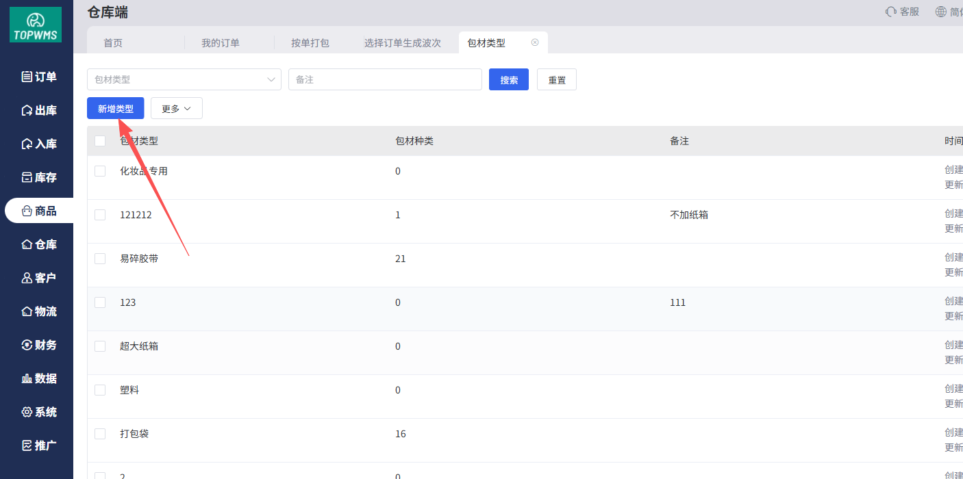 (1)进入WMS仓库端=>商品=>包材类型,点击【新增类型】