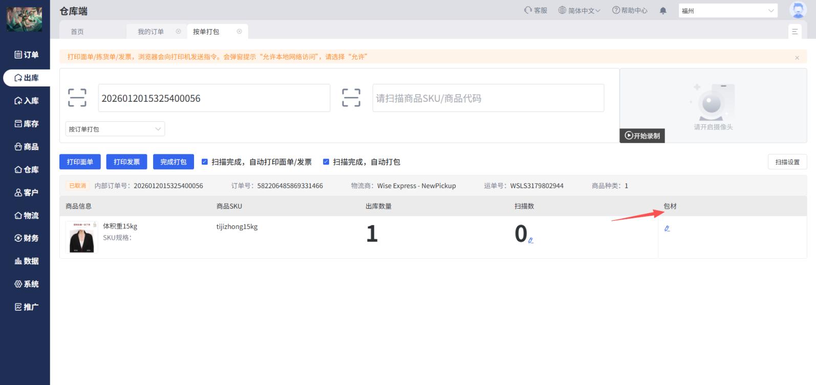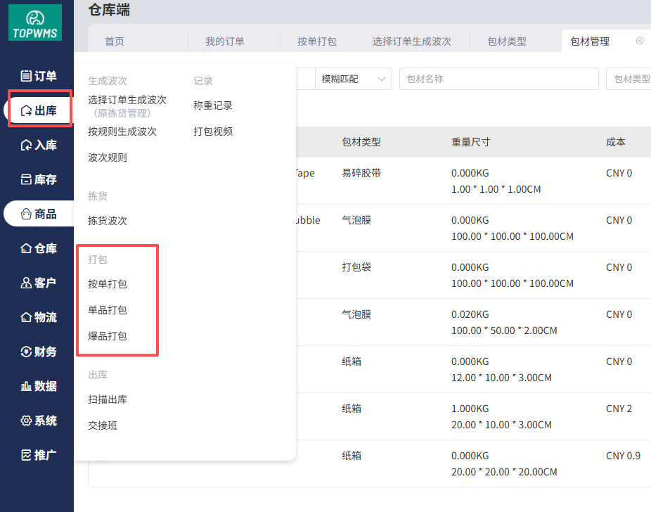 (1)在出库=>打包时,可直接选择包材