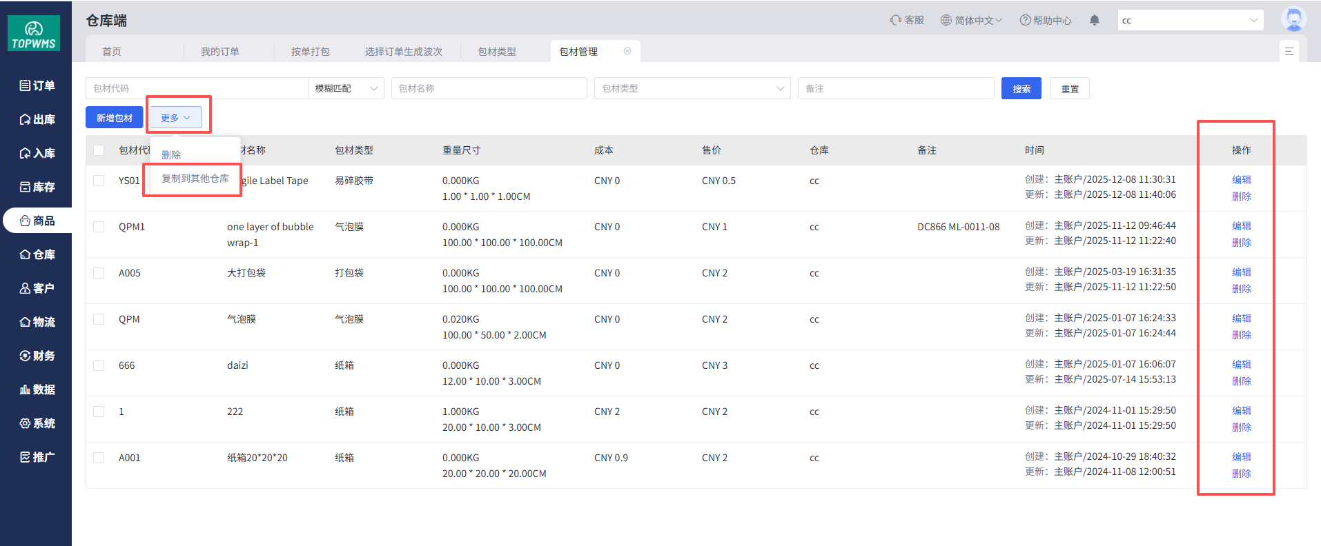 (3)创建包材后,可在包材管理中查看目前已创建的包材信息,支持二次编辑和删除,多仓库的情况下也支持复制到其他仓库,无需二次创建