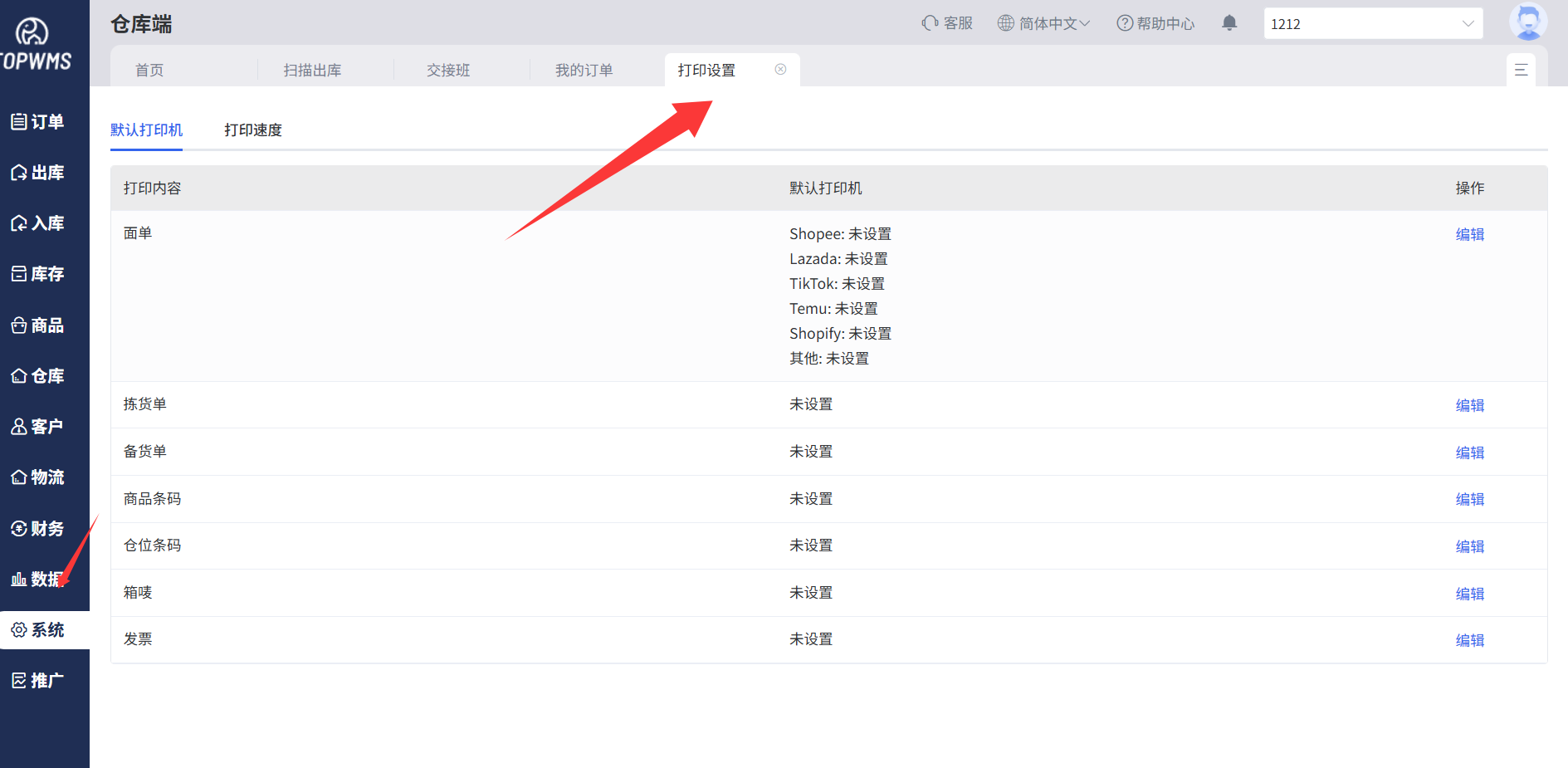 基础设置---打印设置---面单尺寸设置中,面单尺寸没有设置对
