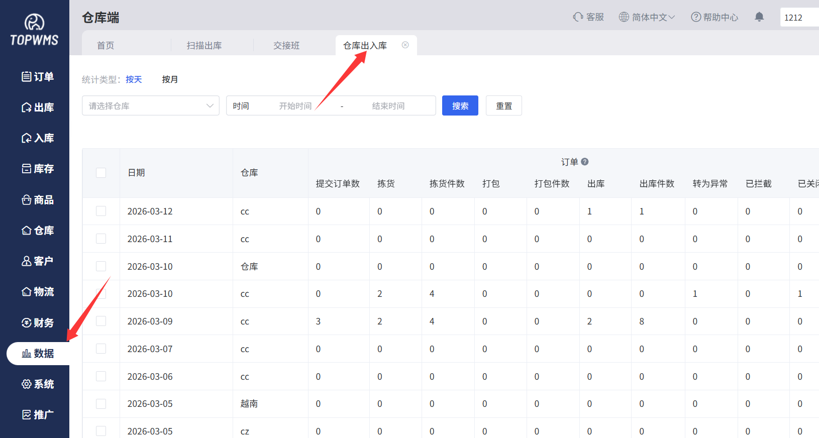 需要查看全部的数据可以在仓库端-数据-仓库出入库界面查看数据
