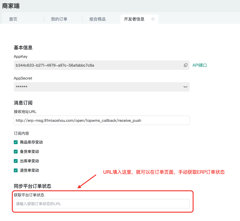 平台订单状态有变动时,ERP会自动回传订单状态到WMS。除此以外,商家还可以手动获取平台订单状态。手动获取平台订单状态的URL:https://erp.91miaoshou.com/api/open/topwms/order/get_order_platform_order_status_list
